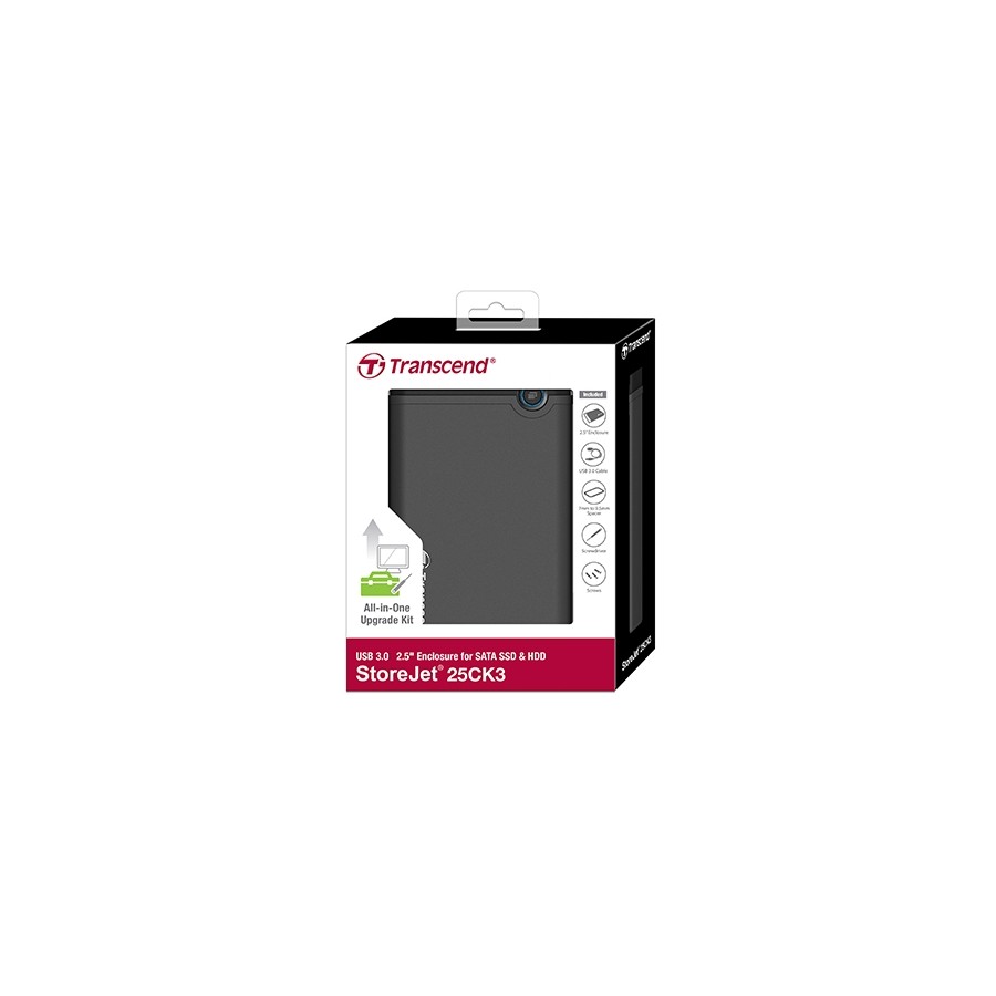 Transcend StoreJet 25CK3 - це стильний портативний корпус з інтерфейсом USB 3.0, в який можуть бути встановлені 2.5-дюймові жорсткі диски або твердотільні накопичувачі, оснащені інтерфейсом SATA і мають товщину до 9.5 мм.