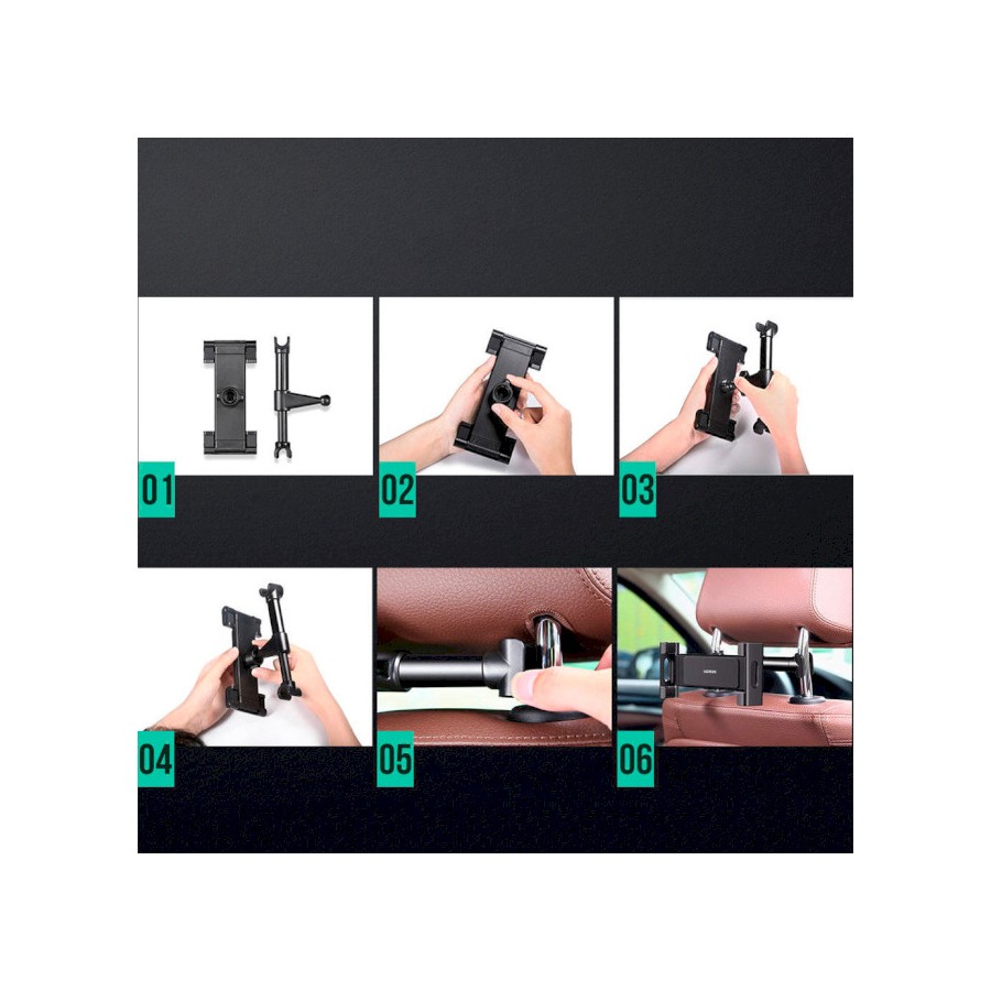 Автомобільний тримач для планшета та телефону у підголовнику легко встановлюється без використання інструментів. Кріплення на підголовник автомобільного сидіння складається з двох частин: затискача та висувного стрижня. Для з'єднання їх використовується гвинт. Висувний стрижень підходить для різних опор підголівників автомобільних сидінь від 101 мм до 144 мм. Затискний затискач підходить для планшетів та смартфонів з діагоналлю від 4.7 до 12.9 дюймів і надійно утримує їх навіть на вибоїстих дорогах або при різкому гальмуванні.