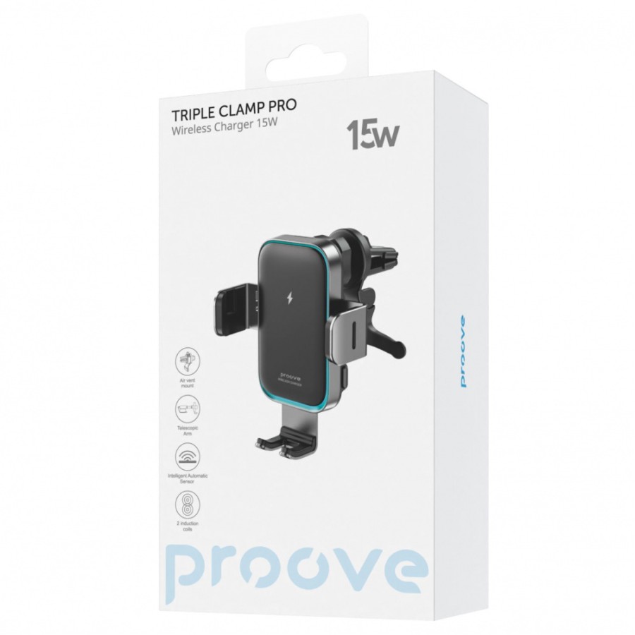 Proove Triple Сlamp Pro виготовлений з алюмінію, що не обтяжує місце кріплення та пасує до салону авто. Вхідна сила струму: 5V/2A, 9V/2A, 12V/1.25A, дає можливість заряджати телефон с потужністю у 15W. Також тримач підтримує протоколи швидкої зарядки QC 3.0, PD та AFC.