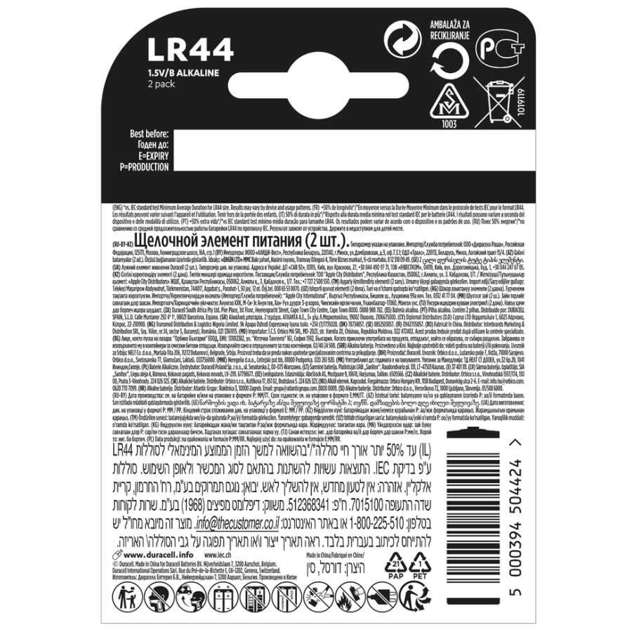 Батарейка DURACELL LR44 / А76 / V13GA / A76 2 шт.
