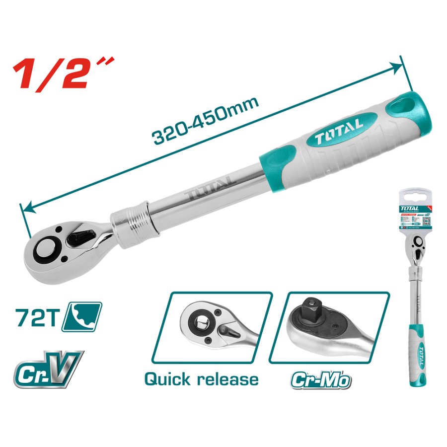 Ключ-тріскачка TOTAL THT106128L це універсальний інструмент, що дозволяє робити величезний перелік ремонтних робіт, в яких необхідно розкручувати та закручувати гайки, болти. Даний ключ виконаний з високоміцного хром-ванадій-молібденового сплаву й оснащений зручною ергономічною телескопічною ручкою з термопластичної гуми. Застосовується з головками для роботи з різьбовими з'єднаннями. Приєднання і фіксація головок здійснюється натисканням на кнопку з протилежного боку ключа. Довжина ключа становить 340-450 мм. Механізм на 72 зубці забезпечує плавний хід.