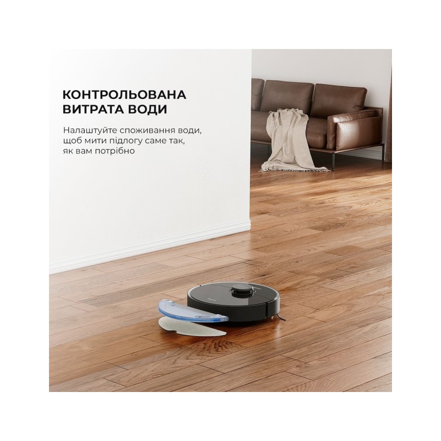 Виходячи з ваших переваг і типу покриття для підлоги ви можете самостійно вибрати необхідну кількість води для подачі на серветку для миття. Але можна встановити автоматичне визначення і робот сам дозуватиме необхідну кількість води для досягнення найкращого результату вологого прибирання. Таким чином ви можете адаптувати витрату води з миючим засобом і покращити якість миття підлоги від в'їлих або засохлих плям від рідин або інших продуктів.