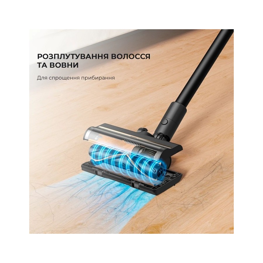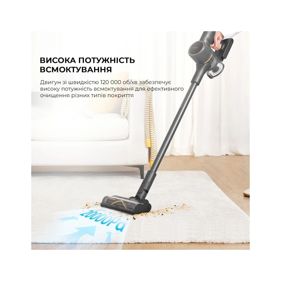 Dreame R10 PRO оснащений потужним мотором та потужним вентилятором для високої ефективності всмоктування пилу, сміття з різних поверхонь, включаючи лінолеум та ламінат, килим та ковролін.