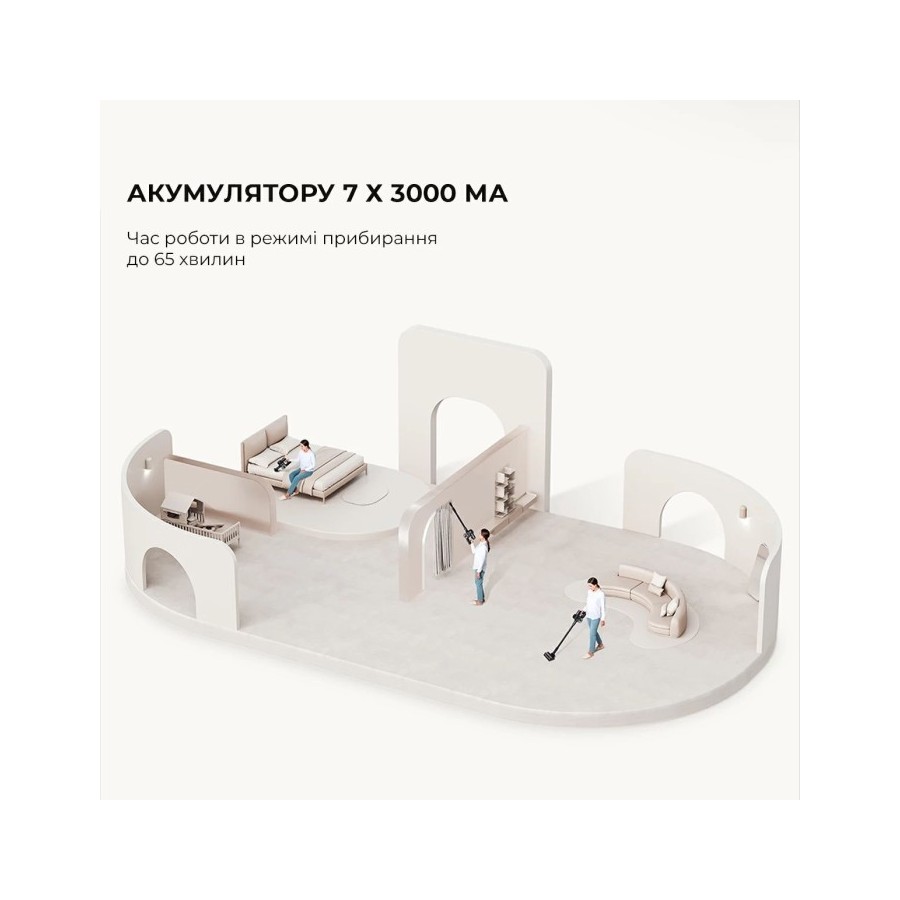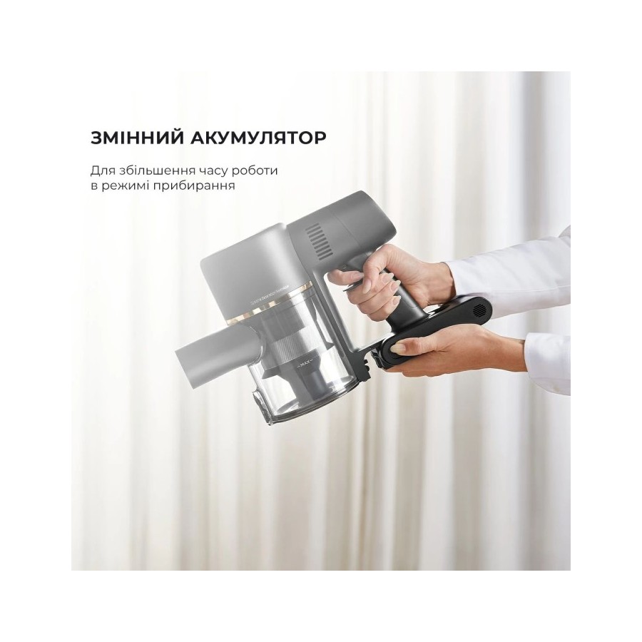Цей пилосос працює на акумуляторі, що дозволяє вільно переміщатися та прибирати приміщення без обмежень у проводах. Вбудований акумулятор забезпечує до 60 хвилин роботи після повної зарядки.