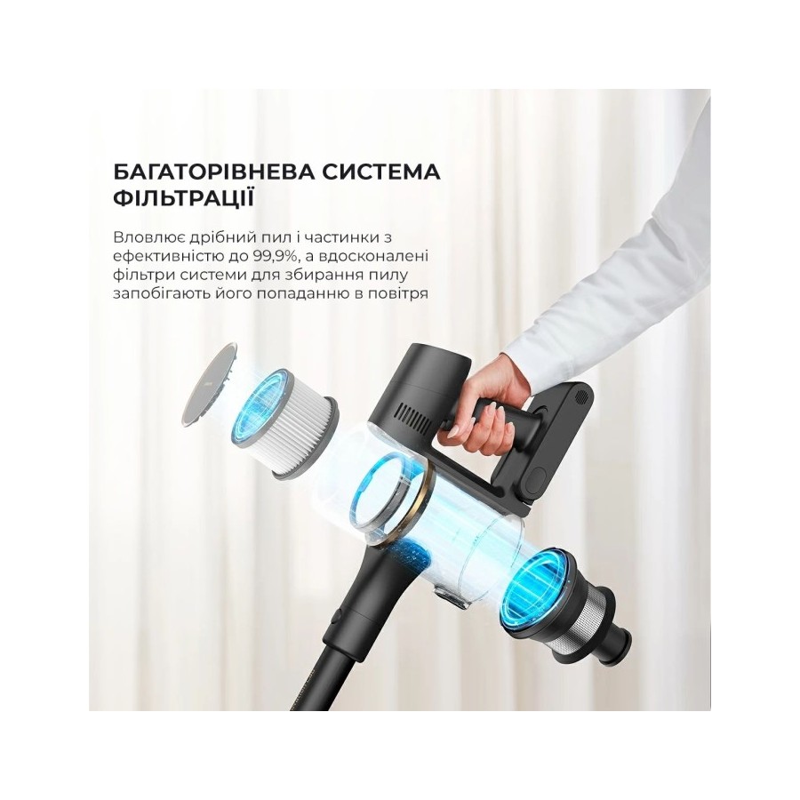 Модель Dreame R10 PRO оснащена багаторівневою системою фільтрації, яка здатна захоплювати дрібні частинки пилу та алергени. Це робить її ідеальною для людей, які страждають на алергію. П'ятиступінчаста система фільтрації – це робота циклонного фільтра, фільтра для великого сміття та НЕРА-фільтра. Пилосос ефективно прибирає сміття і великої, і дрібної фракції, забезпечуючи ідеальну чистоту.