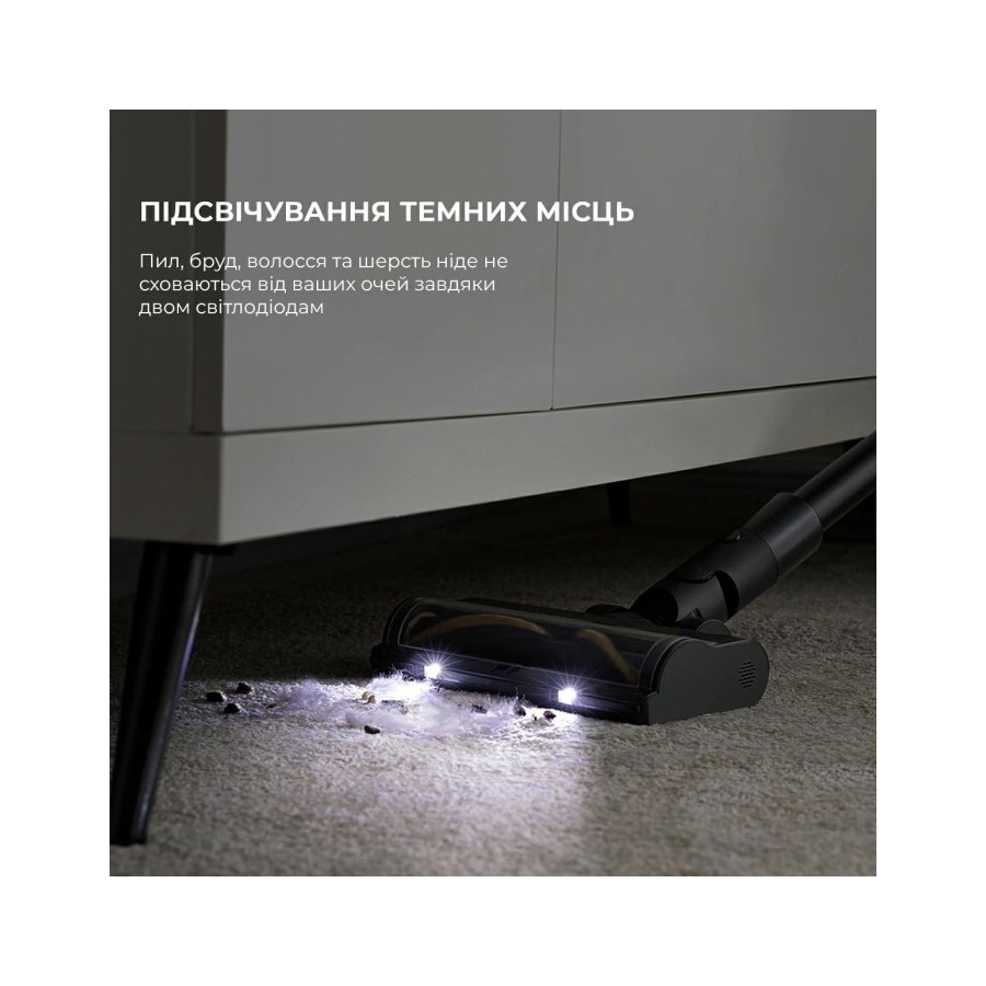 Якщо ви прибираєте у вечірній час доби, підсвічування буде просто необхідним. Таку функцію має модель Dreame R10 PRO. 2 LED-лампи, створюють локальне підсвічування.