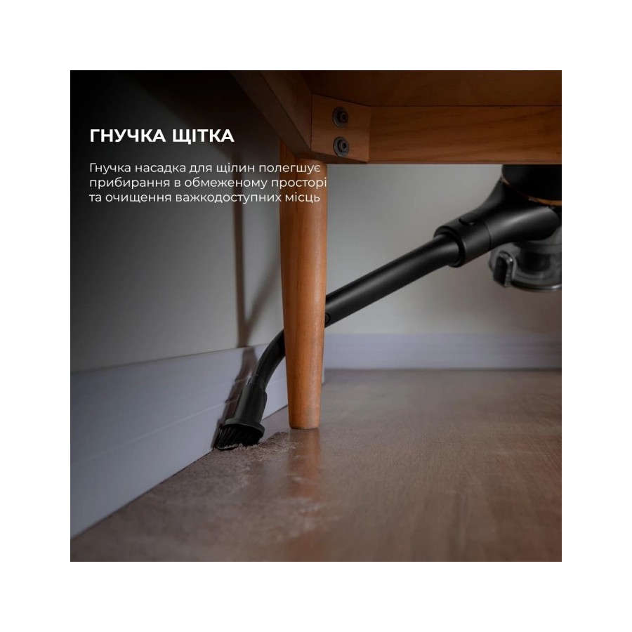 Акумуляторний пилосос без проблем підлаштовується під будь-яке покриття за допомогою універсальної щітки. Адаптивна щітка збирає сміття ще сильніше. Її головка, що плаває, адаптується під будь-яку поверхню і наближається до плінтусів на відстань 7 мм. Пристрій є маневреним і прибирає сміття навіть у кутах та важкодоступних місцях. Щетинки мають V-подібну форму, що дозволяє легко прибирати вовну та волосся, дрібний пил та бруд.