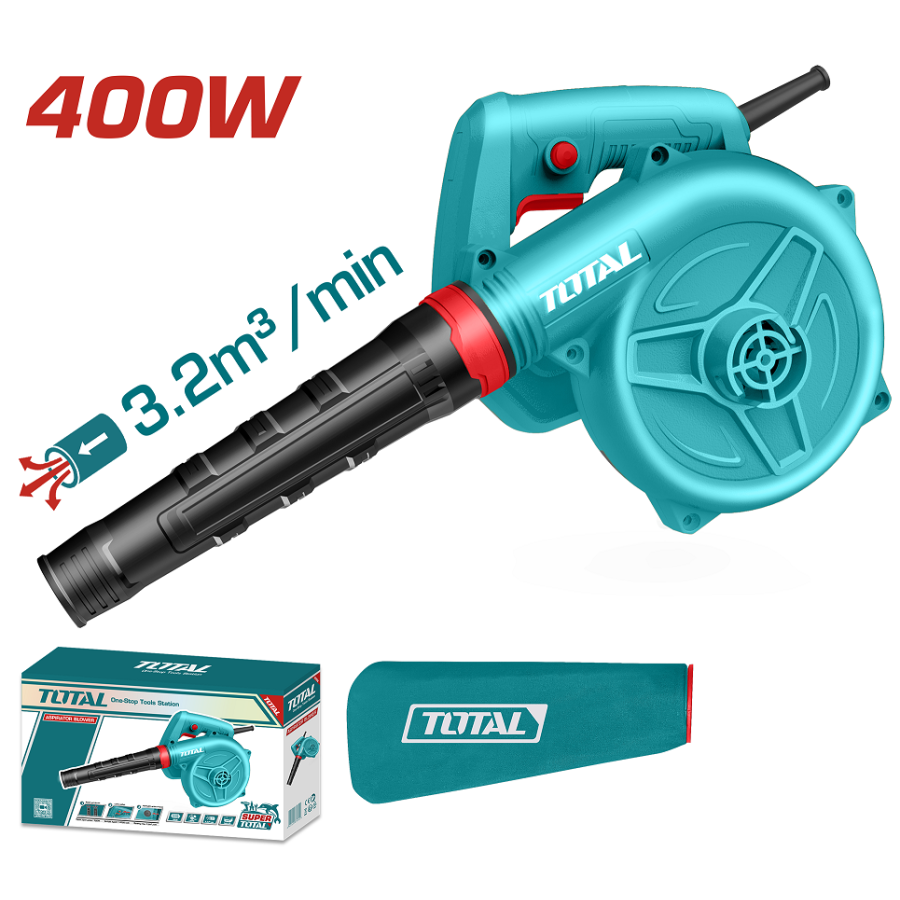 Повітродувка TOTAL TB4036 призначена для очищення робочого місця від сміття, такого як тирса, деревна або металева стружка. Еластичне покриття рукоятки для комфортної експлуатації. Має два режими роботи: повітродувка та пилосос. Швидкість без навантаження становить 14000 об/хв, витрата повітря - 3.2 м³/хв, потужність - 400Вт. До комплекту входить мішок для пилу, коробка.