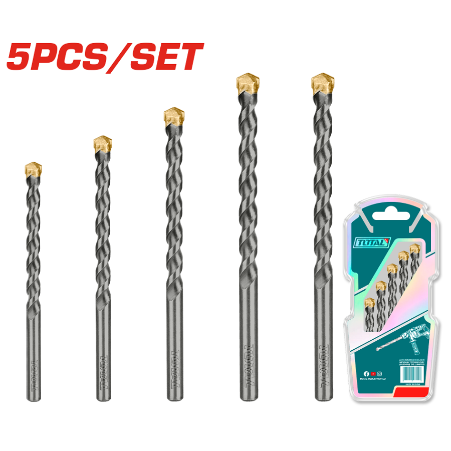 Набір свердел TOTAL TACSD5055 для ударного свердління бетону або цегли. Свердла мають твердосплавну напайку. Розміри: 4х75 мм, 5х85 мм, 6х100 мм, 8х120 мм, 10х120 мм.