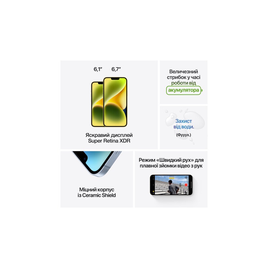 Нова основна камера та покращена обробка зображень дозволяють робити ще більше сенсаційних знімків за будь-якого освітлення — особливо за слабкого. Камера нового Айфон 14 оснащена великим сенсором і збільшеною діафрагмою, яка пропускає на 49% більше світла. Ультраширококутна камера дозволяє відобразити унікальні ракурси та охопити більшу частину кадру. А нічний режим автоматично вмикається під час зйомки у слабкому освітленні, в результаті чого ви отримуєте яскравіші та чіткіші фотографії. Smart HDR 4 розпізнає до чотирьох людей у кадрі та автоматично покращує контрастність, освітлення та тон шкіри для кожного з них. До того ж, режим «Портрет» фокусує увагу на об'єкті зйомки, майстерно розмиваючи фон.