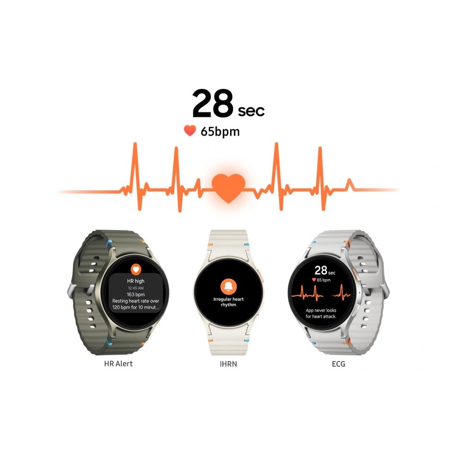 Функція кардіомоніторингу забезпечить вам спокій. Вбудований датчик PPG у вашому годиннику Galaxy Watch7 відстежує частоту серцевих скорочень і серцевий ритм. Якщо він виявляє порушення у роботі вашого серця, він сповіщає вас про це разом із пропозицією зробити ЕКГ для детальнішого дослідження вашого стану.