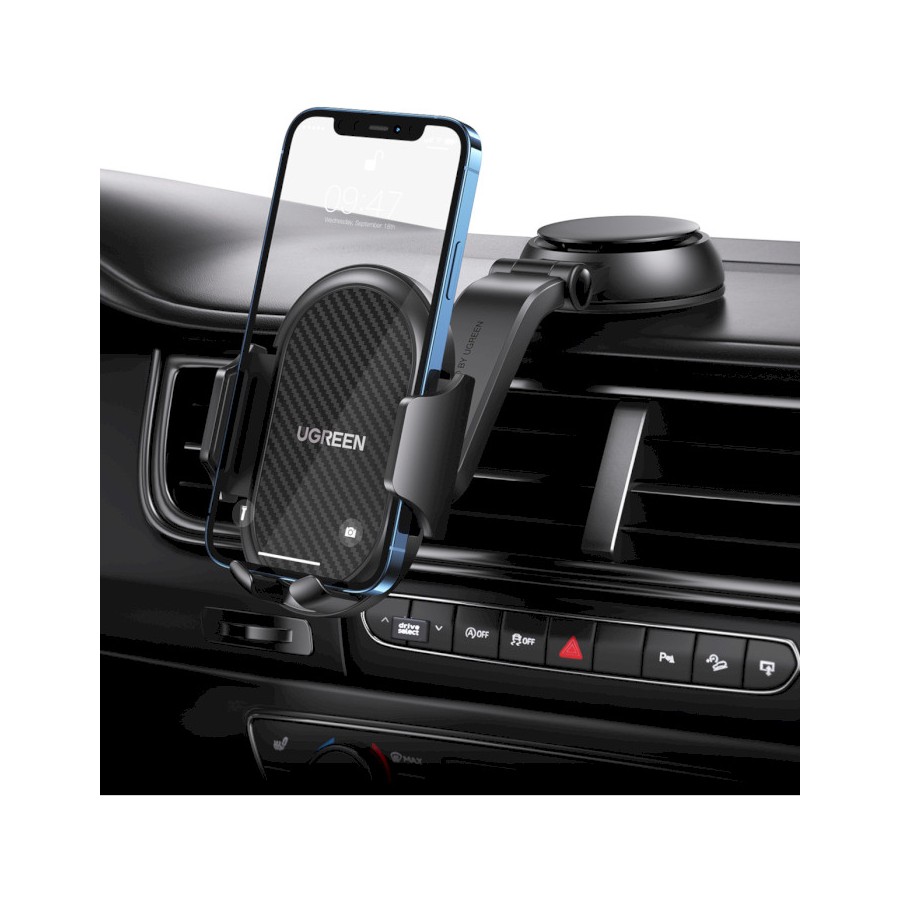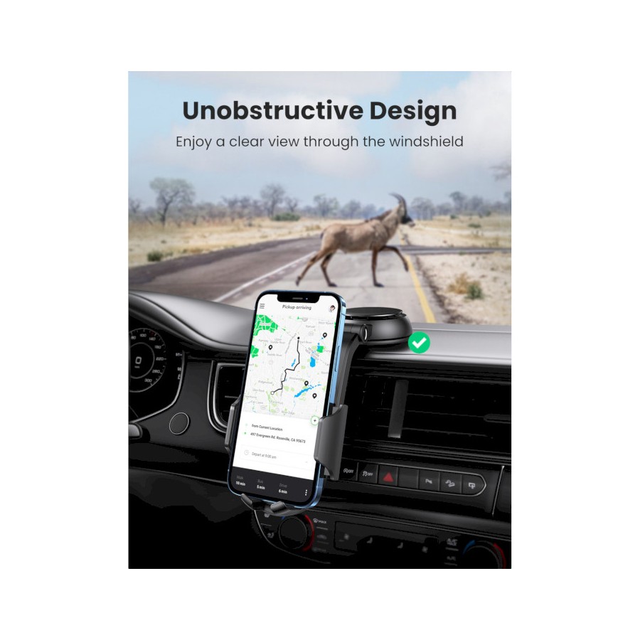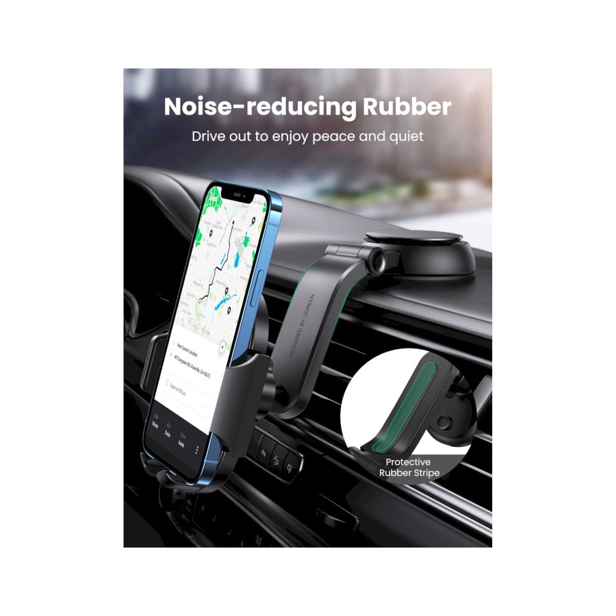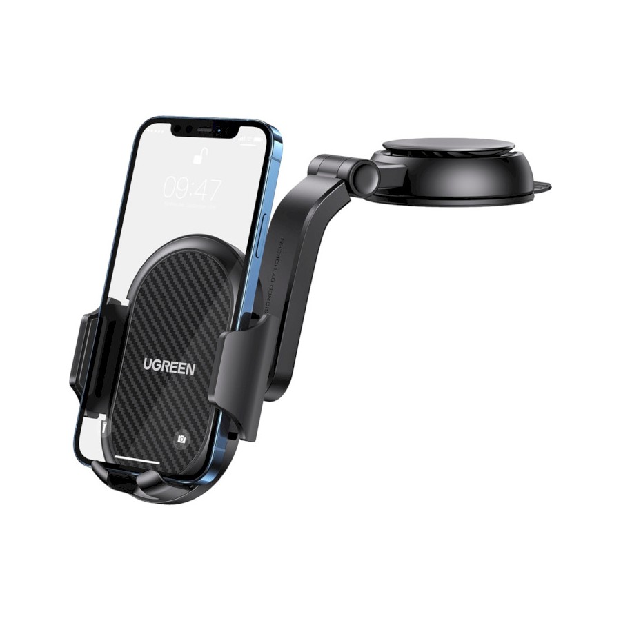 Автомобільний тримач Ugreen LP405 кріпиться за допомогою присоски на панель приладів, що забезпечує вільний доступ до телефону під час руху. Модель має гравітаційний затискач, завдяки чому пристрій надійно тримається навіть під час їзди бездоріжжям.