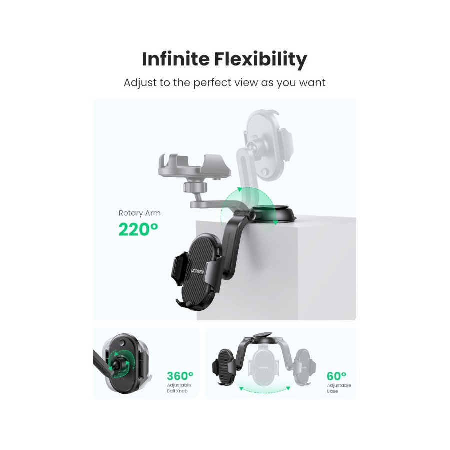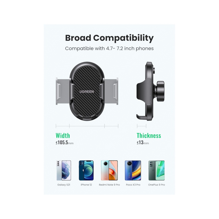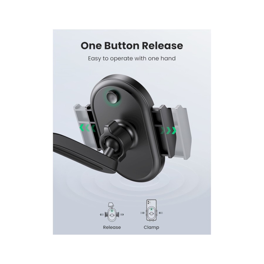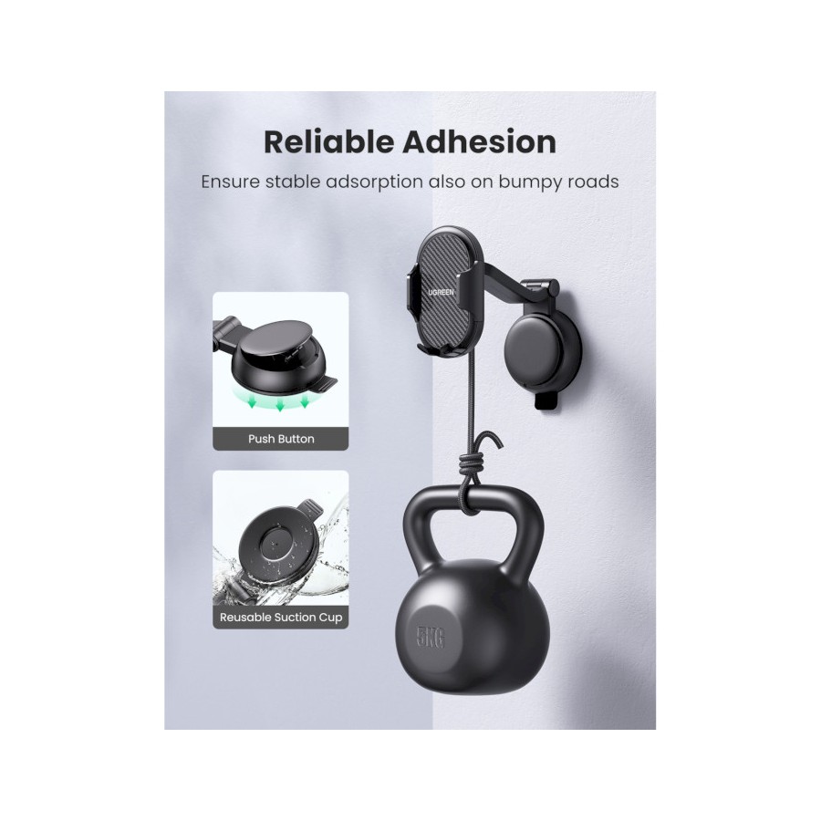 Автомобільний тримач Ugreen LP405 кріпиться за допомогою присоски на панель приладів, що забезпечує вільний доступ до телефону під час руху. Модель має гравітаційний затискач, завдяки чому пристрій надійно тримається навіть під час їзди бездоріжжям.