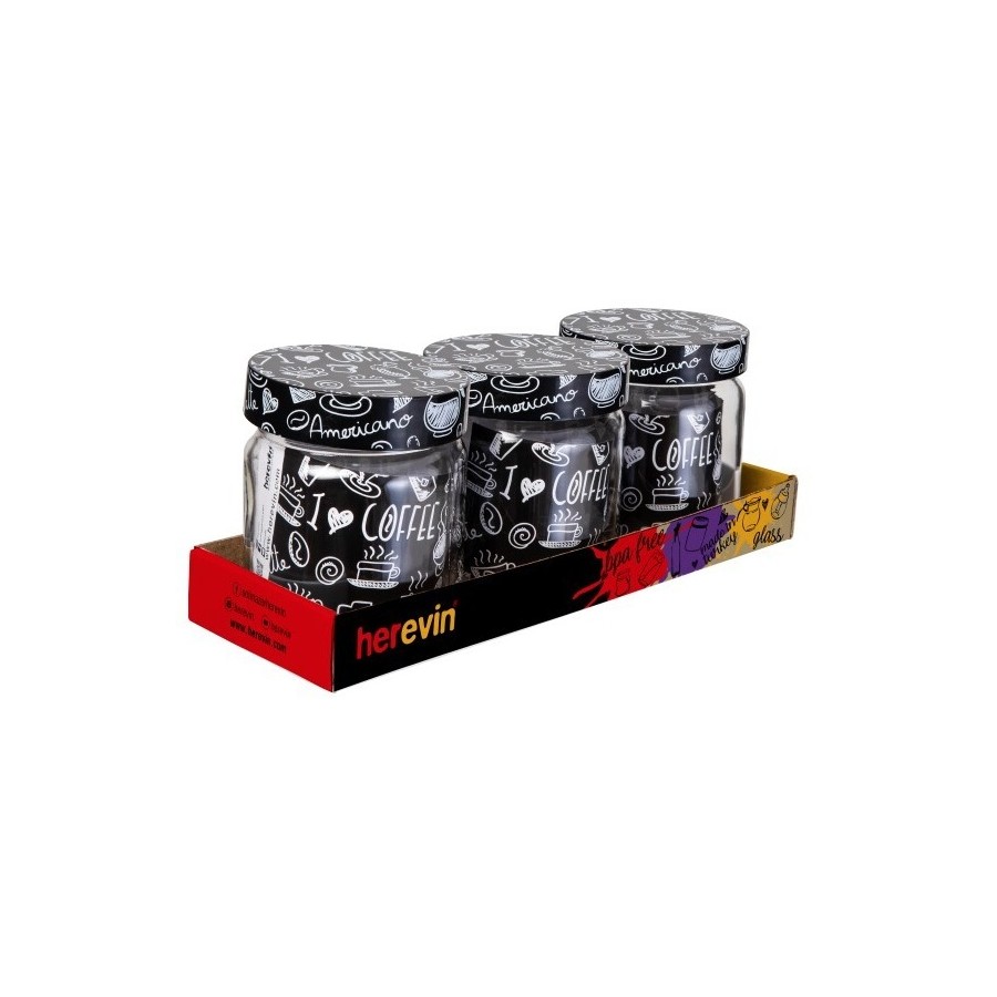 Набір банок 3 шт HEREVIN Coffee 0.425 л виготовлений з високоякісного скла та підходить для зберігання різних харчових продуктів. Кришка закручується і захищає продукти від потрапляння вологи, комах і сторонніх запахів. Стильний дизайн ідеально впишеться в будь-який інтер'єр кухні. Безпечно мити в посудомийній машині.