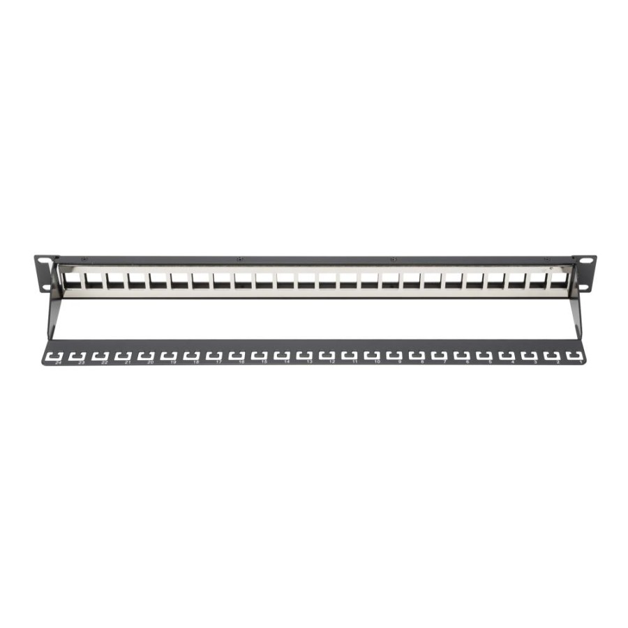 Модульна комутаційна панель від DIGITUS спеціально розроблена для установки в 19-дюймову стійку і для монтажу модулів DIGITUS Keystone. Модульна патч-панель доступна в двох різних кольорах: Чорний (RAL 9005). Матеріал корпусу - SPCC, холоднокатана С-сталь товщиною 1,5 мм відповідно до стандарту JIS G3141-1996. Задній лоток зі спеціально розробленими місцями для кабельних стяжок поставляється у вигляді оснастки для простого монтажу. Комплект заземлення також постачається з модульною комутаційною панеллю.