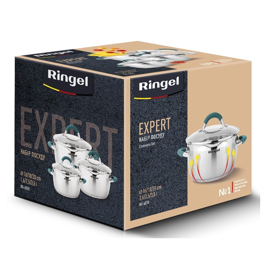 Набір посуду з нержавіючої сталі серії EXPERT від Ringel має привабливий зовнішній вигляд, відмінну функціональність і надійну і ергономічну конструкцію. Завдяки застосуванню нержавіючої полірованої сталі в якості матеріалу виготовлення, каструля EXPERT поєднує в собі естетичну привабливість і практичність.