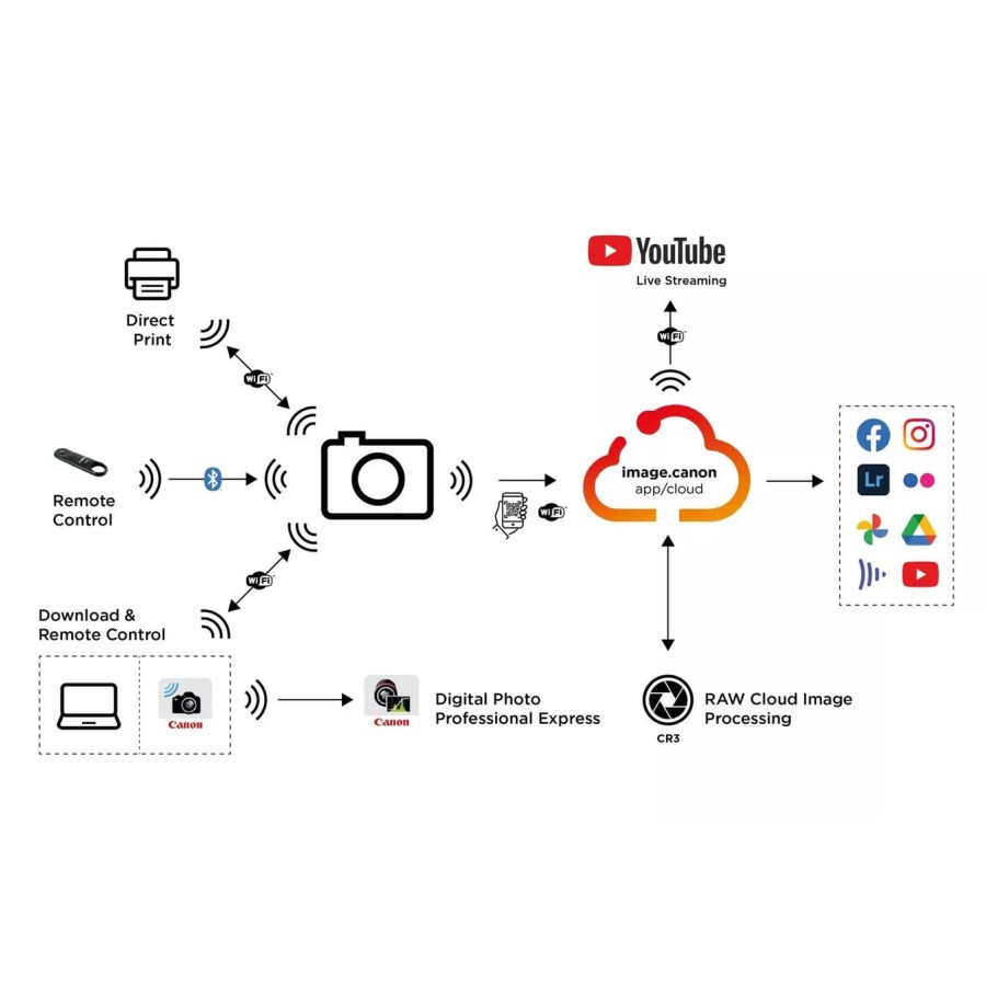 Вбудовані модулі Wi-Fi® і Bluetooth® забезпечують підключення EOS R8 до інтелектуальних пристроїв, мереж Wi-Fi і ноутбуків. Діліться фотографіями та відео з підписниками й друзями, а також керуйте камерою дистанційно.