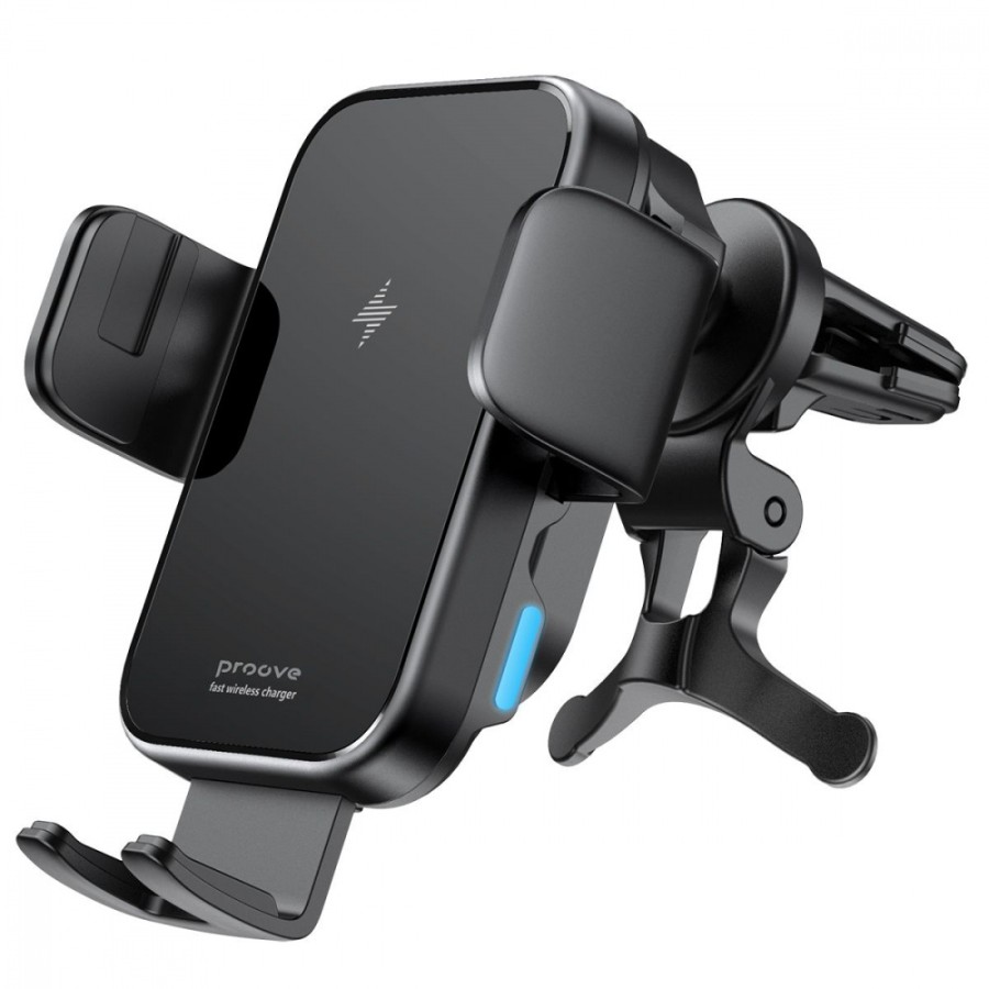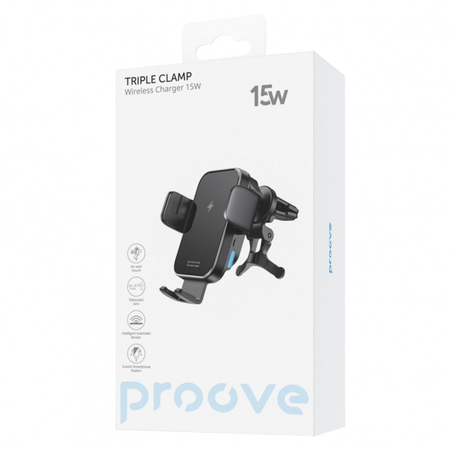 Proove Triple Сlamp виготовлений з алюмінію, що не обтяжує місце кріплення та пасує до салону авто. Вхідна сила струму: 5V/2A, 9V/2A, 12V/1.25A, що дає можливість заряджати телефон с потужністю у 15W. Також тримач підтримує протоколи швидкої зарядки QC 3.0, PD та AFC.