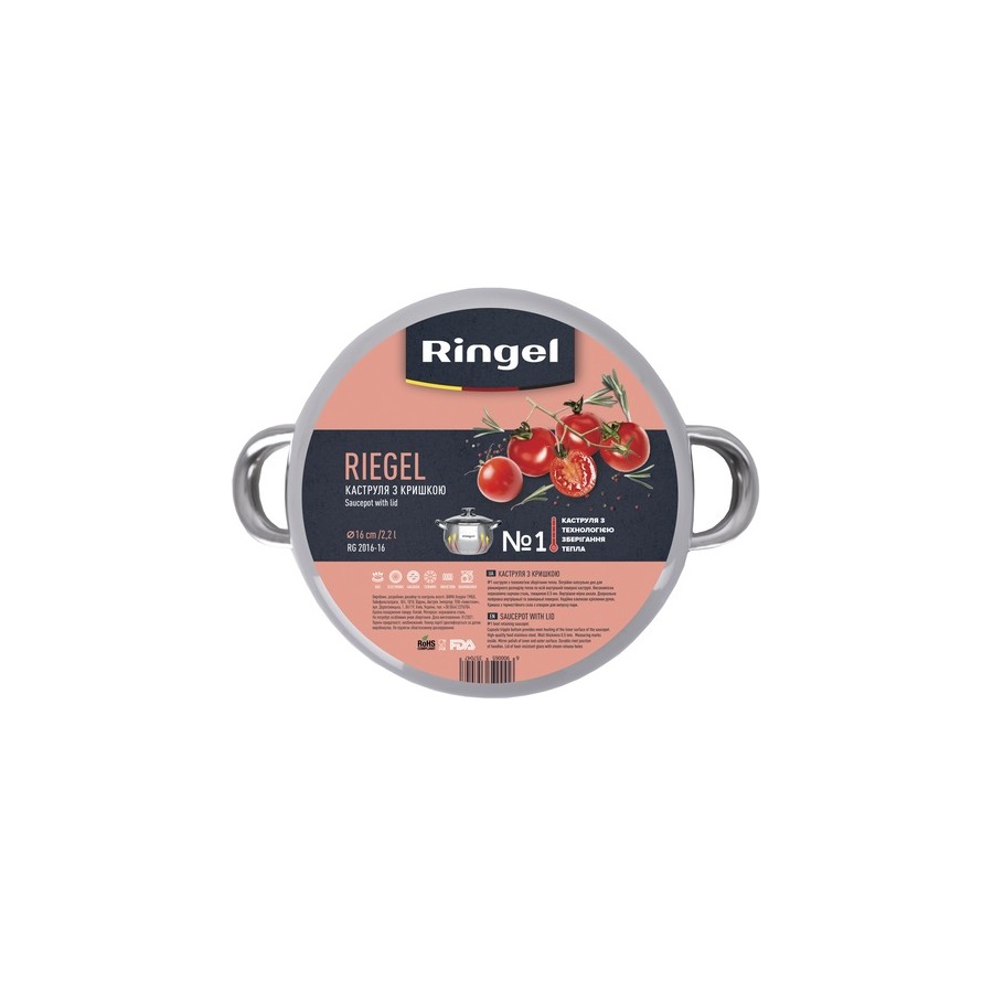 Форма каструль серії RIEGEL - «яблуко». Каструля Ringel виготовлена з високоякісної нержавіючої сталі з оптимальним вмістом хрому та нікелю, завдяки чому каструля відмінно захищена від корозії, не деформується навіть при високотемпературному нагріванні та при цьому є цілком безпечною для здоров'я. Товщина стінок у даній каструлі становить 0,5 мм, що забезпечує виробу міцність і довговічність.