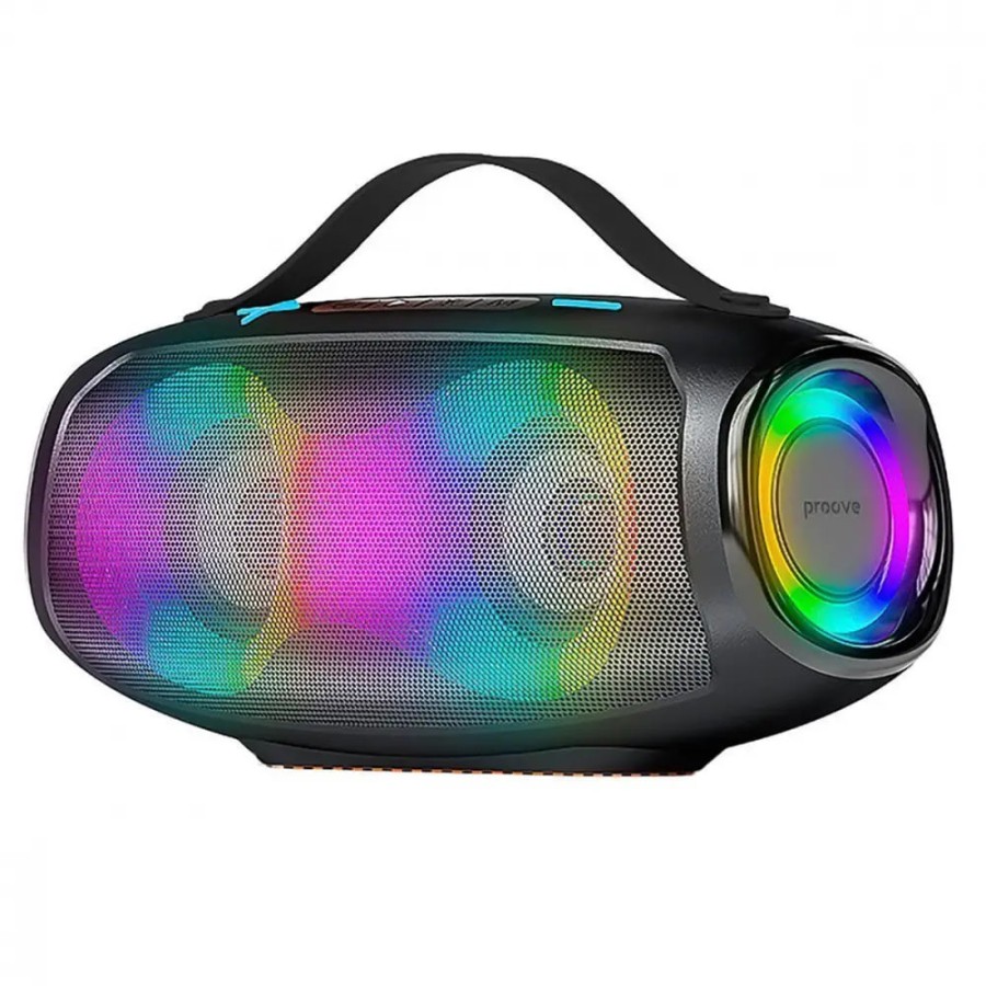 Колонка Proove Stellar середнього розміру, її зручно тримати та транспортувати завдяки силіконовій ручці. Зверху на корпусі знаходяться кнопки керування. З їх допомогою можна вмикати та вимикати пристрій, налаштовувати LRD-підсвітку, гучність, перемикати композиції та режими. Ззаду розташовані роз'єми для TF/Type-C/USB.