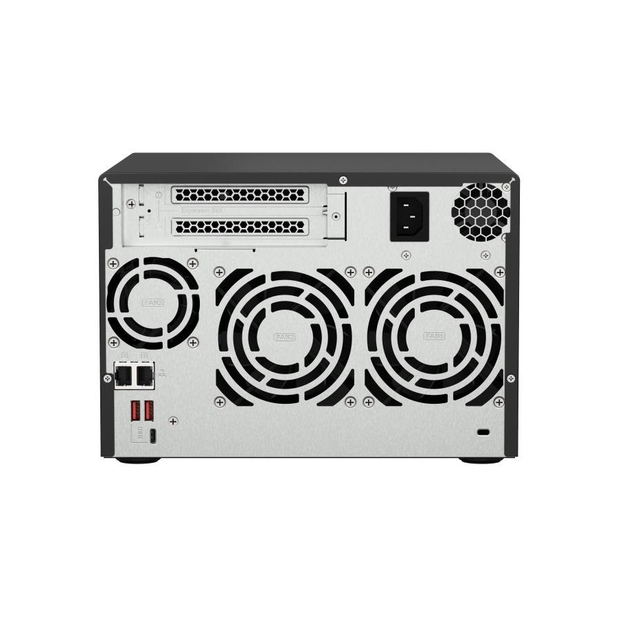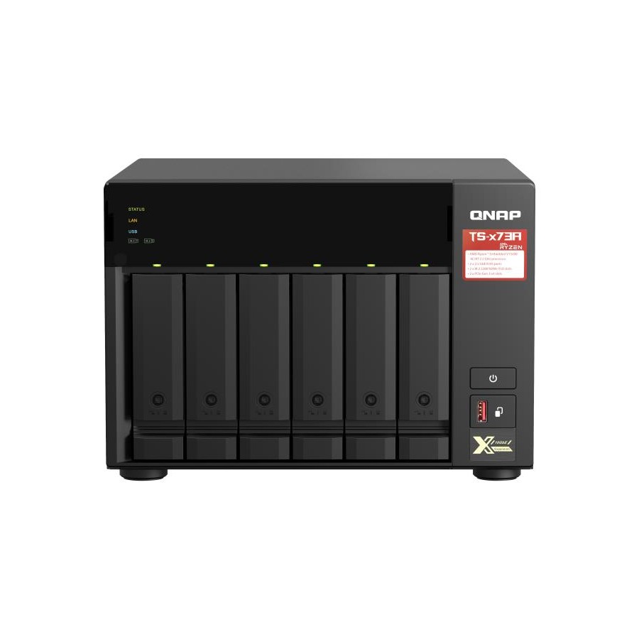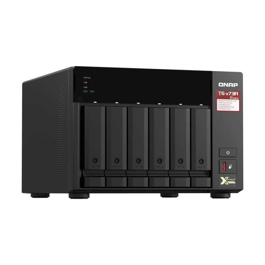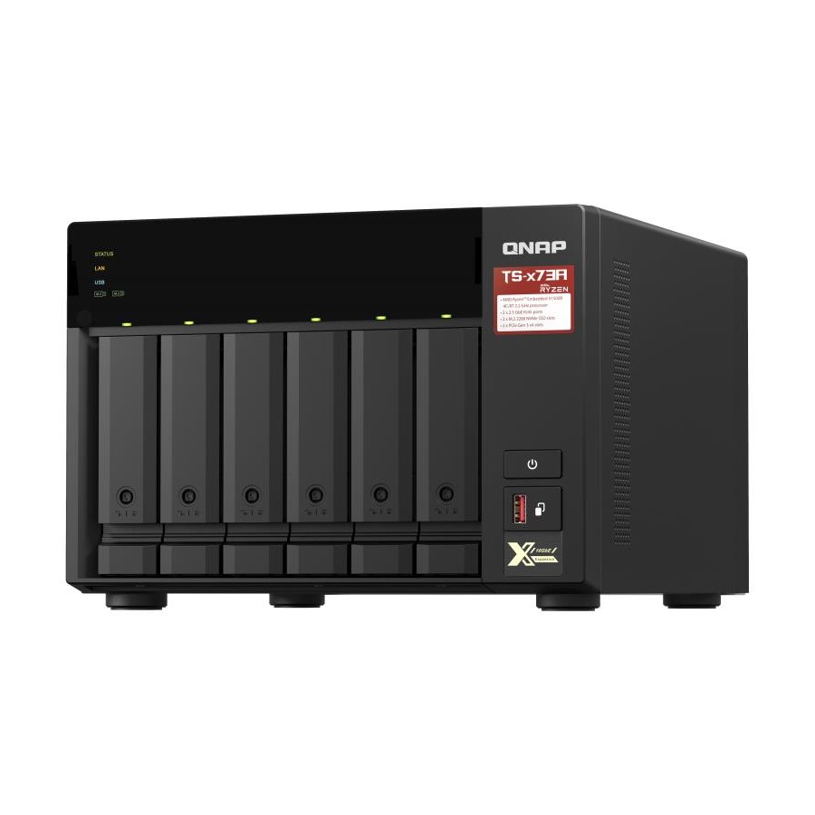 Featuring an AMD Ryzen V1000 series V1500B quad-core processor that delivers great system performance with up to quad-core / 8 threads and Turbo Core up to 2.2 GHz. The TS-673A features two 2.5GbE RJ45 ports and two PCIe Gen 3 slots for you to flexibly deploy 5GbE/10GbE networks. Two M.2 NVMe SSD slots for Qtier Technology and SSD Caching enable constant storage optimization. The TS-673A supports QTS and QuTS hero, allowing users to flexibly switch operating system based on their requirements.
