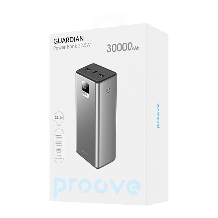 Proove Guardian обладнаний Led-дисплеєм, що показує поточну кількість заряду. Також повербанк підтримує швидку зарядку Apple 20W, PD та Quick Charge.