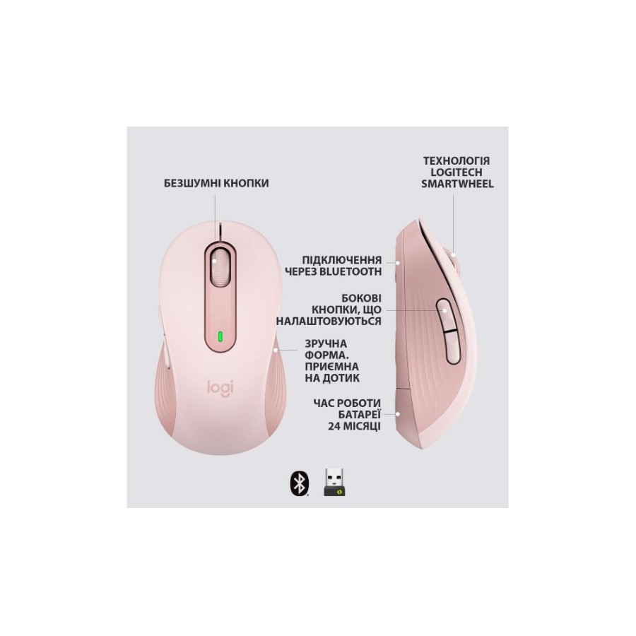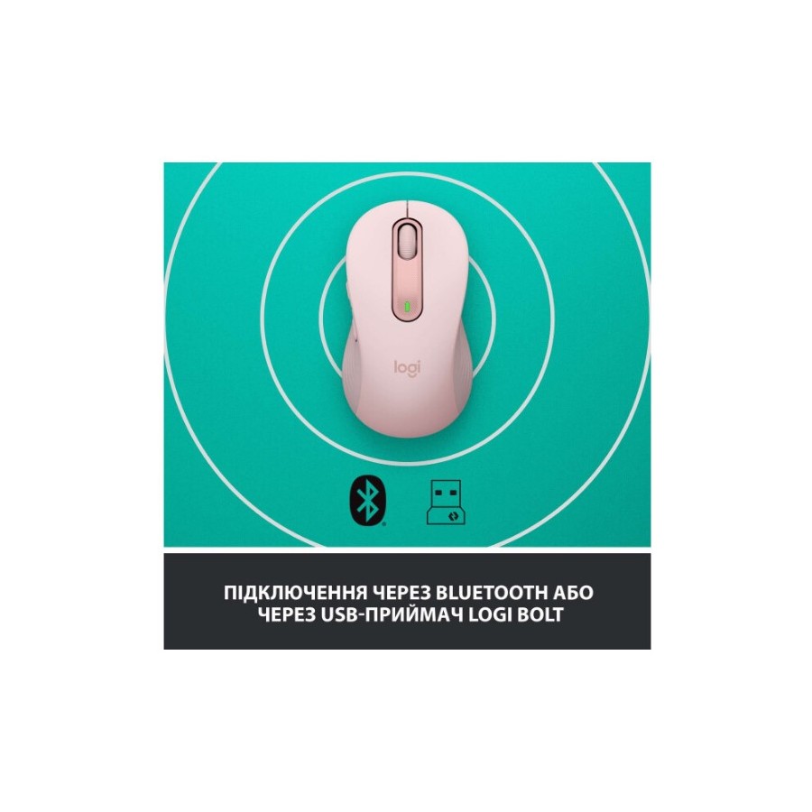 Бездротова миша Logitech Signature M650 L з технологією SmartWheel і бічними кнопками, що налаштовуються, забезпечує комфорт і допомагає підвищити ефективність офісної роботи. Під'єднання за допомогою USB-приймача Logi Bolt або через Bluetooth дає можливість заощаджувати місце на робочому столі й обходитися без дротів.