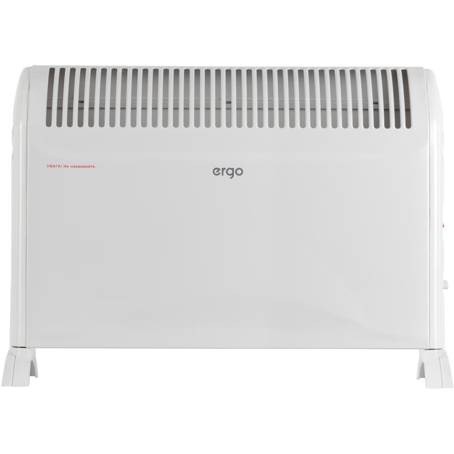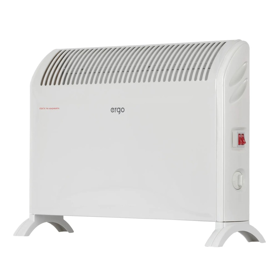 Електричний конвектор ERGO HC 202020 з відкритим нагрівальним елементом типу Zig-zag має два рівня потужності – 1000 / 2000 Вт, що дозволяє пристосувати його для обігріву приміщень площею до 20 м.кв. Конвектор може підтримувати певну температуру в приміщенні завдяки механічному термостату. Прилад може бути встановлено на підлозі за допомогою спеціальних опор, які входять до складу комплекту обігрівача.