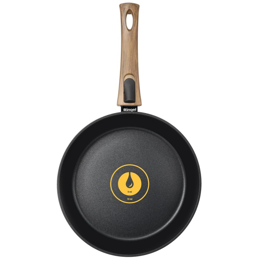 У кожну сковороду RINGEL інтегрована перша у світі система дозування олії. Найменша поділка системи відповідає 5 мл олії, а більша – 10 мл олії. За допомогою цієї системи ви зможете легко та швидко приготувати водночас здорові та смачні страви з використання мінімуму жиру та з максимальним збереженням корисних речовин у страві.