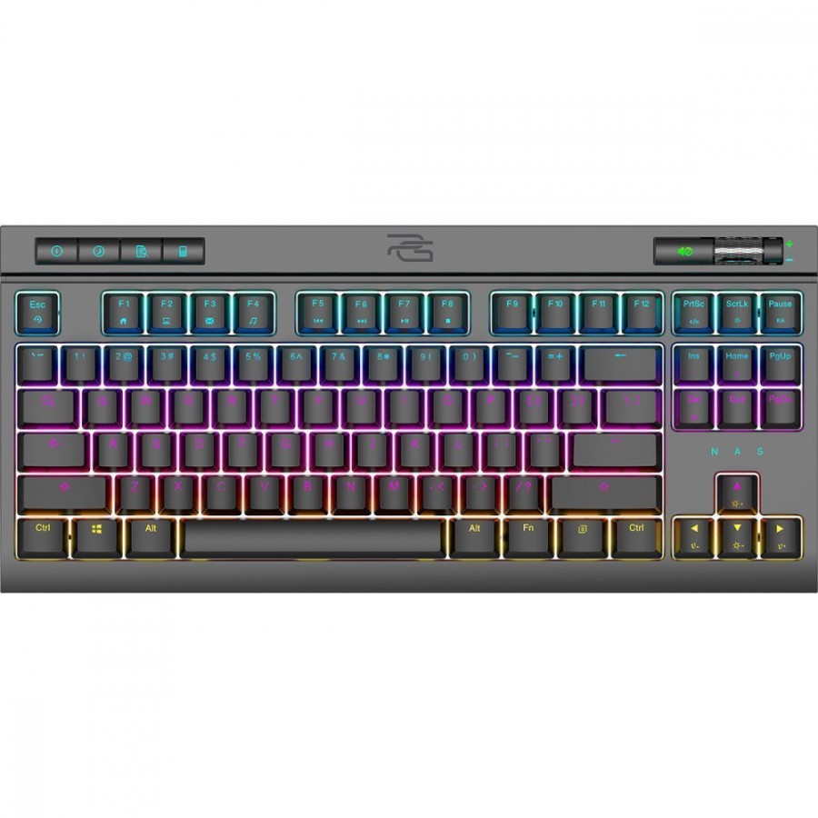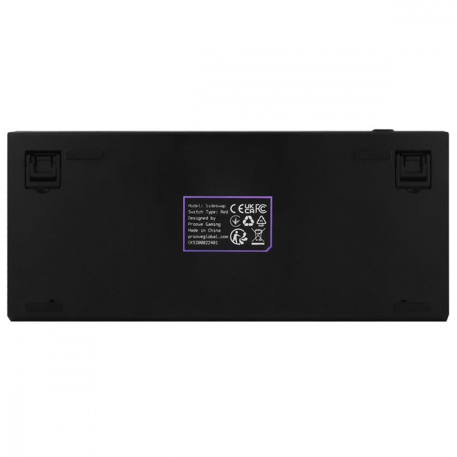 Клавіатура має розмір 85%, а це означає, що аксесуар не оснащений блоком NUM-пада. Однак на верхній панелі, біля фірмового логотипа Proove Gaming (PG), розташовані функціональні клавіші, якими можна регулювати увімкнення та вимкнення комп'ютера, режим сну, довідник та калькулятор, а також керування звуком. Технологія Hot-Swap на клавіатурі дозволяє легко замінювати перемикачі без необхідності пайки, забезпечуючи зручність налаштування та обслуговування.