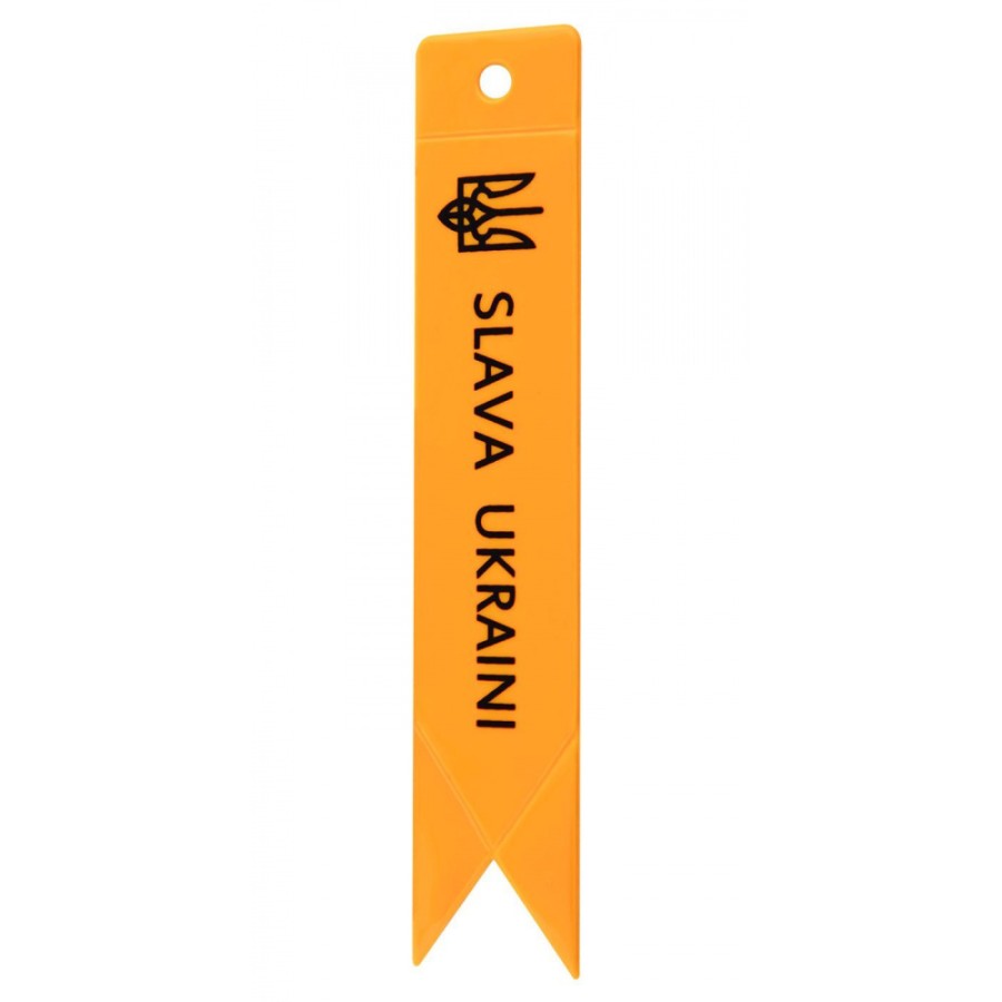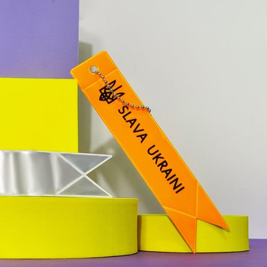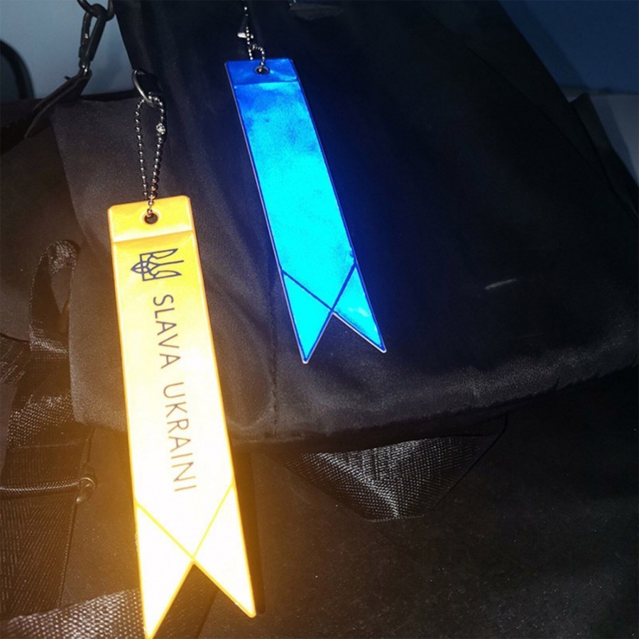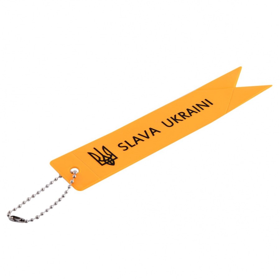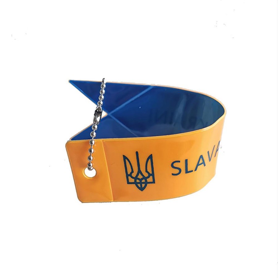 Аксесуар оформлений у кольорах прапора України та прикрашений написом “Слава Україні”.