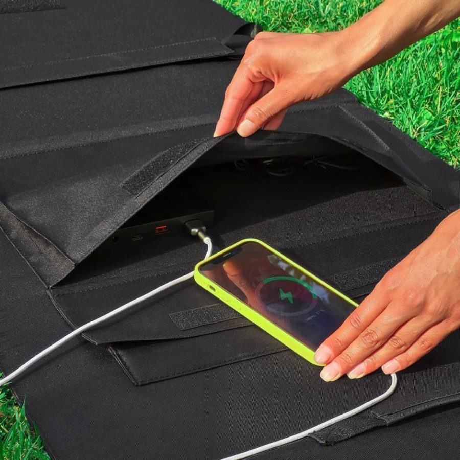 Зарядна станція має складану конструкцію, що спрощує зберігання та транспортування, а також 3 додаткові опори, які допоможуть розмістити сонячну панель з максимальною ефективністю.
