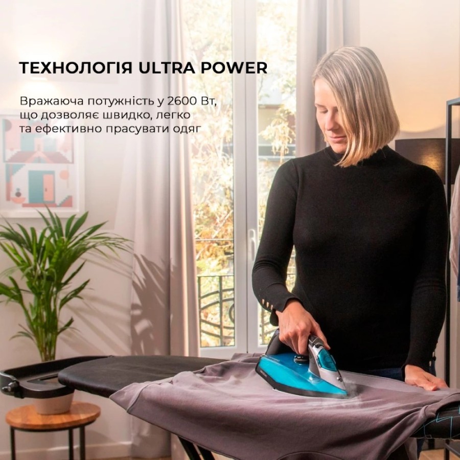 Потужність 2600 Вт Коли ранок починається не з кави, а запізнення на важливу зустріч, потужність вирішує все. Fast&Furious не підведе та швидко напрасує костюм. Технологія Ultra Power підтримує робочу потужність 2600 Вт — завдяки їй праска впорається з безнадійно зім’ятими речами.