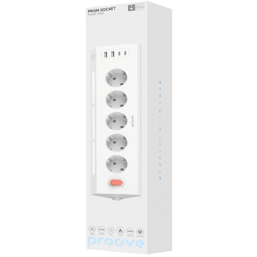 Proove Prism Socket дозволяє одночасно підключити до дев’яти пристроїв. П’ять розеток AC підходять для живлення побутової техніки, а порти USB і Type-C дозволяють заряджати смартфони, планшети, навушники й інші мобільні ґаджети без використання додаткових адаптерів.