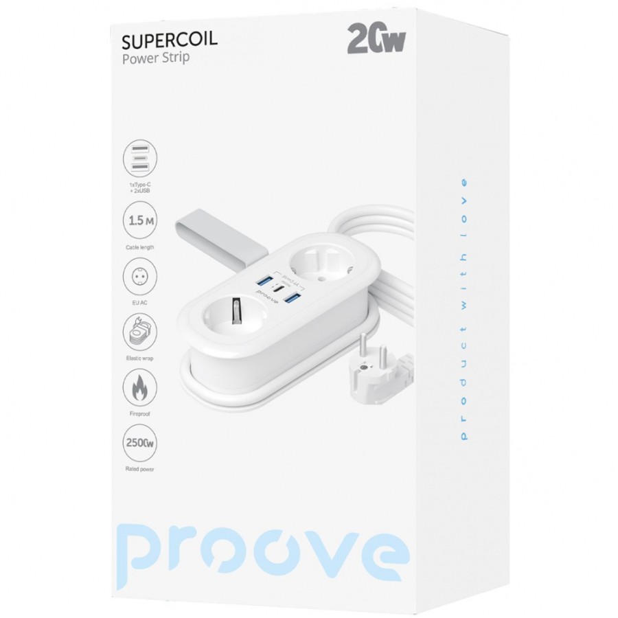Proove Supercoil оснащений вбудованим інтелектуальним чіпом, який розпізнає тип підключеного пристрою та автоматично регулює силу струму для безпечного заряджання. Захищає техніку від коротких замикань, перегріву, перенапруги та перевантаження. Вогнестійкий корпус знижує ризики займання у разі аварійних ситуацій.