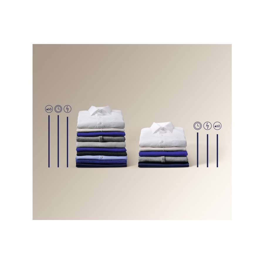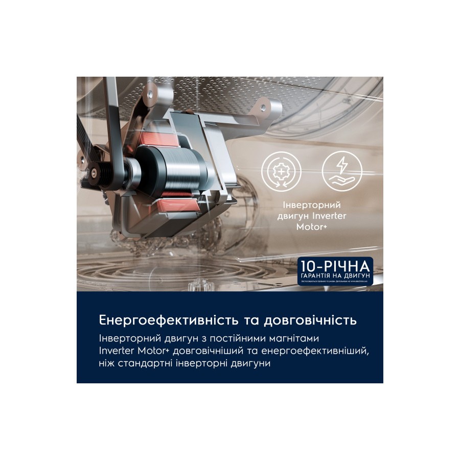 Серцем цієї моделі є інверторний двигун Inverter Motor+, який забезпечує не лише енергоефективність, але й знижений рівень шуму — лише 53 дБ під час прання. Система SensiCare автоматично регулює тривалість циклу, запобігаючи надмірному пранню та зберігаючи якість тканин.