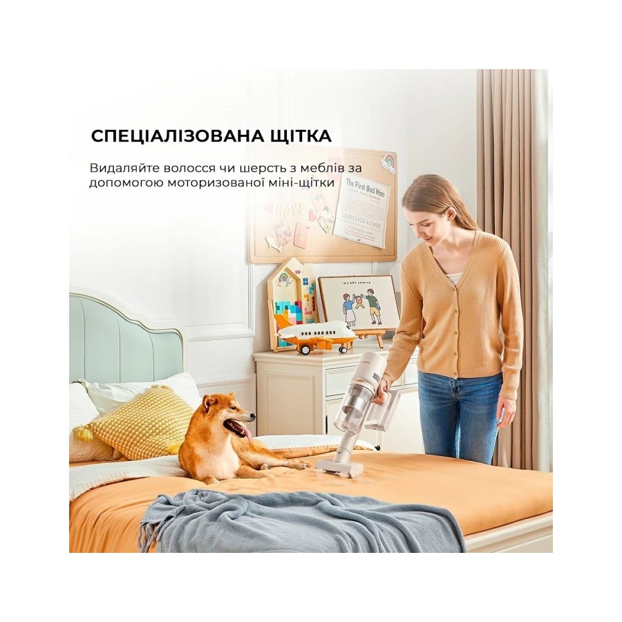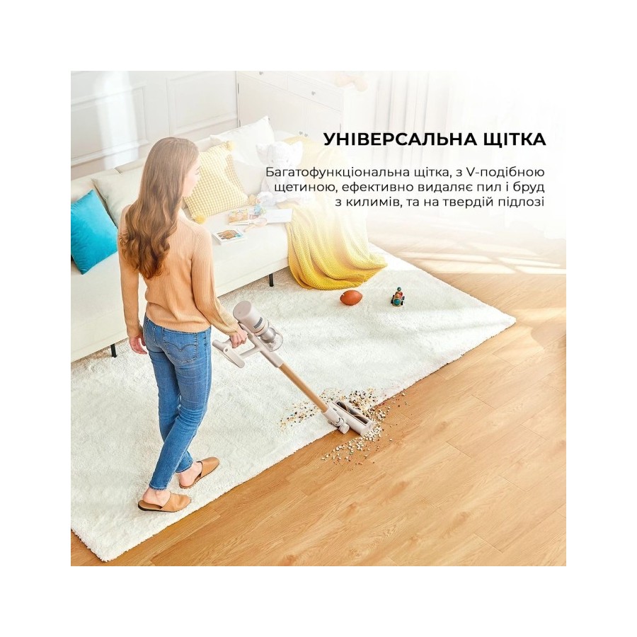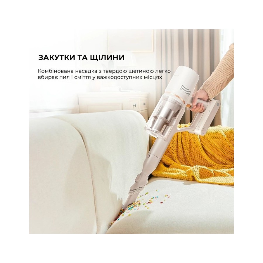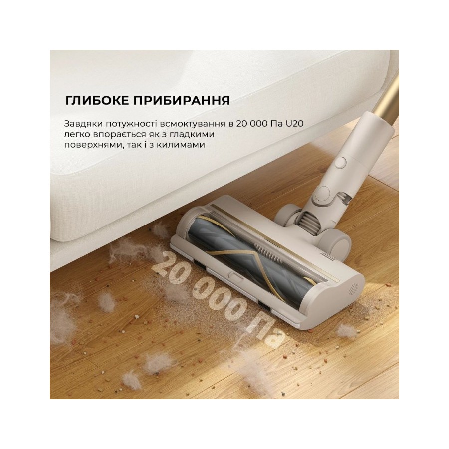 У кожного девайса є своя маленька місія. І у Dreame U20 це — робити прибирання швидким та приємним. Бо тут замість довгих дротів та масивних насадок — свобода рухів без прив’язки до розеток. Корпус важить усього 1,6 кг, тож ви не втомитесь від тривалого прибирання. За автономність відповідає акумулятор на 2500 мАг — його заряду вистачає на 60 хвилин. Потужністю всмоктування 22 000 Па дозволяє збирати пил, пісок та шерсть на всіх типах покриття, від килимів до підлогової плитки. Однак ви не обмежені прибиранням підлоги, а можете очищати меблі чи навіть салон авто. В комплекті йде насадка 2-в-1 для щілин, кутів та меблевих поверхонь, а також моторизована щітка для оббивки та текстилю.