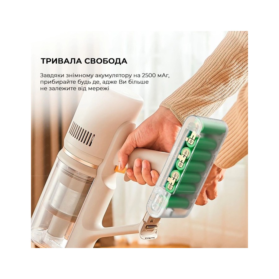 Пилосос оснащений Li-on акумулятором на 2500 мАГ, що забезпечує до 60 хвилин безперервної роботи. Акумулятор розташований біля ручки та знімається одним рухом. Тому ви зможете замінити батарею на нову, коли це буде потрібно.
