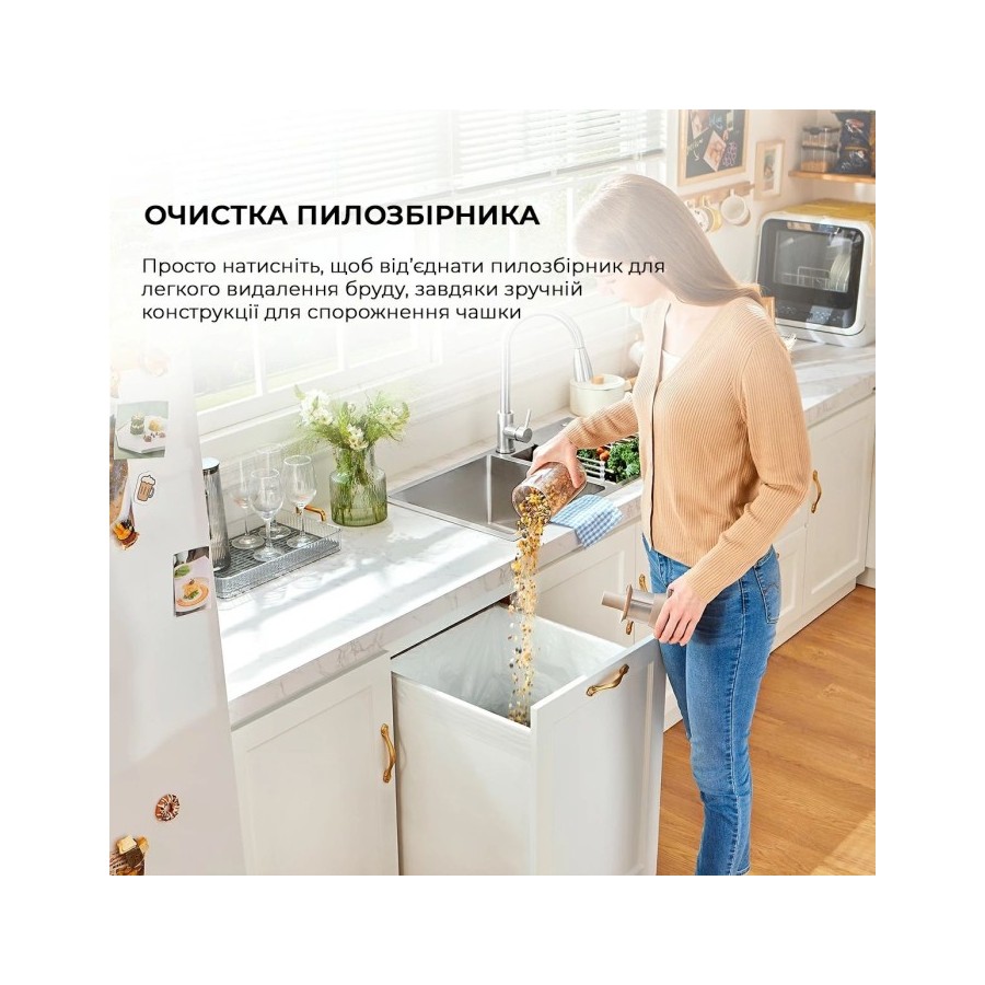 Коли сеанс закінчено, залишається звільнити пилозбірник від сміття. А це робиться у кілька рухів. Просто натисніть на кнопку, від’єднайте контейнер та висипте бруд у сміттєвий бак.