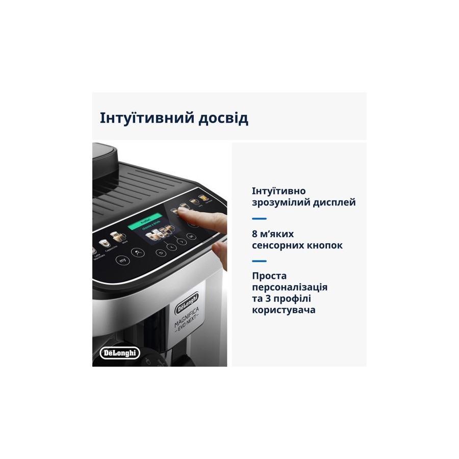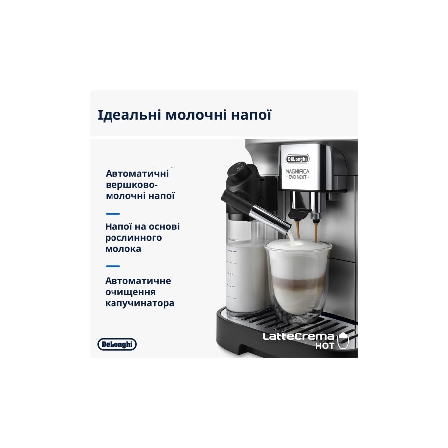 Magnifica Evo Next embodies the De'Longhi experience, know-how and technology to always offer the best in-cup results. It satisfies every coffee taste with a choice of 13 drinks through the user-friendly interface with coloured icons and TFT display. Personalise your drinks with 5 sizes, 4 levels of intensity and 3 temperature options, and relish a fine, rich foam using LatteCrema Hot Technology for all your milk-based drinks.
