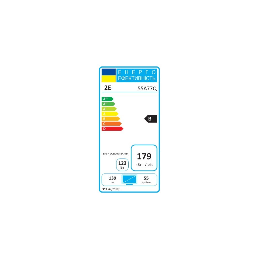 Завдяки стильному й сучасному дизайну модель 2E-55A77Q гармонійно пасуватиме до будь-якого інтер’єру, а можливість кріплення за стандартом VESA 200 × 200 мм дає змогу монтувати телевізор на стіну. Пристрій має енергоспоживання 123 Вт, забезпечуючи при цьому ефективну роботу та розумне використання енергоресурсів.
