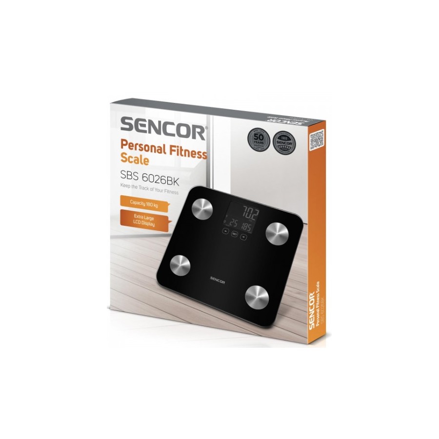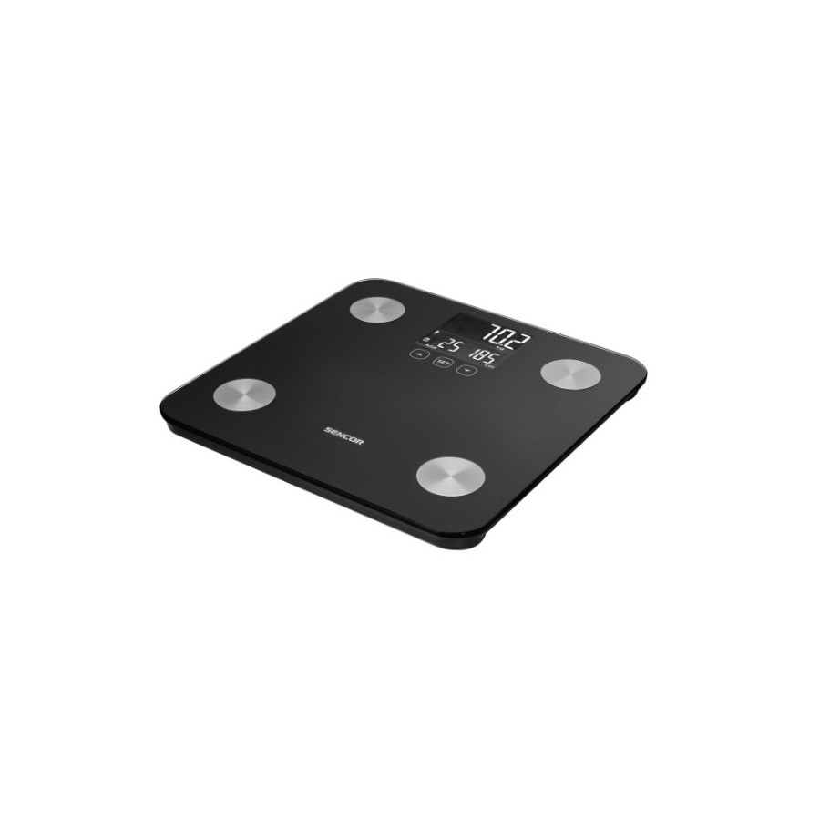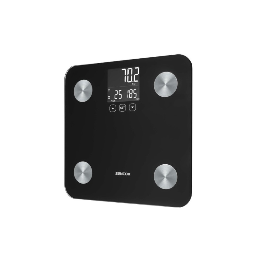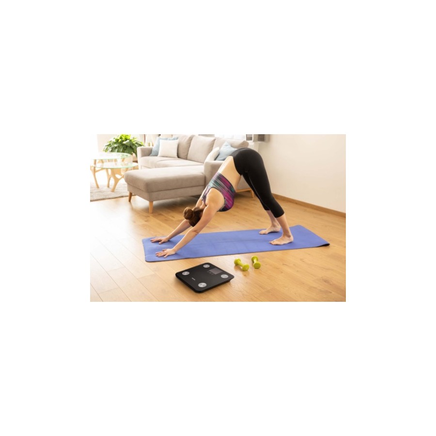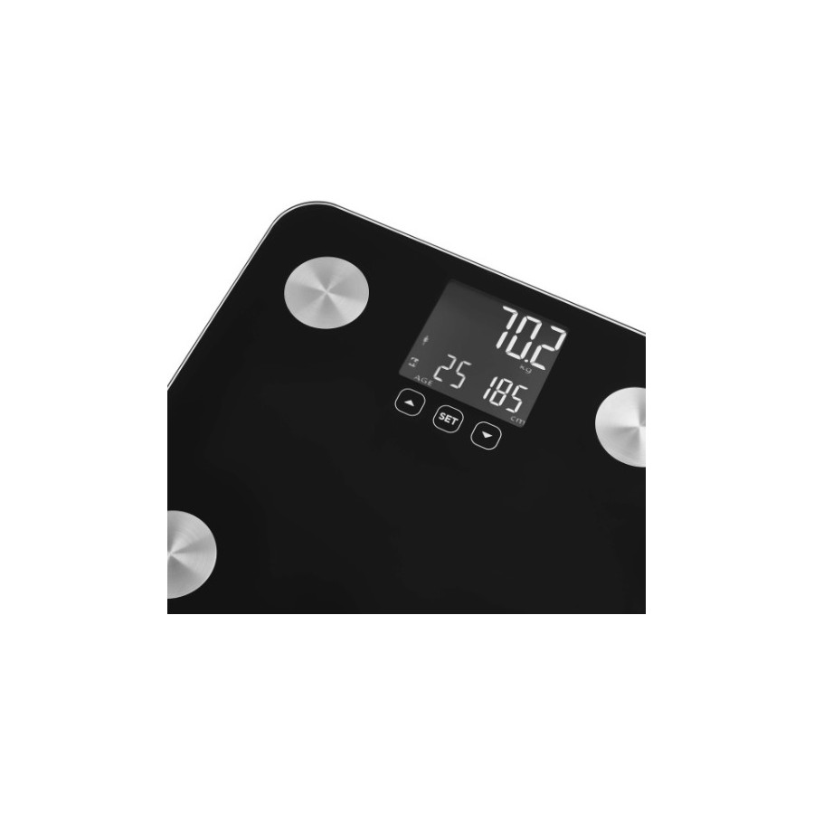 Персональні фітнес ваги. Ваги вимірюють не тільки вагу, але й параметри тіла та аналізують їх. Ваги також легко контролювати за допомогою сенсорних кнопок і легкого для читання дисплея з підсвічуванням. Ваги також привернуть увагу завдяки дизайну зі скляною платформою для зважування. Це робить ваги ідеальними для будь-якої кімнати, їх легко чистити та обслуговувати. Має великий РК-дисплей з підсвічуванням. Поєднання скла та поверхні з нержавіючої сталі для легкого обслуговування.