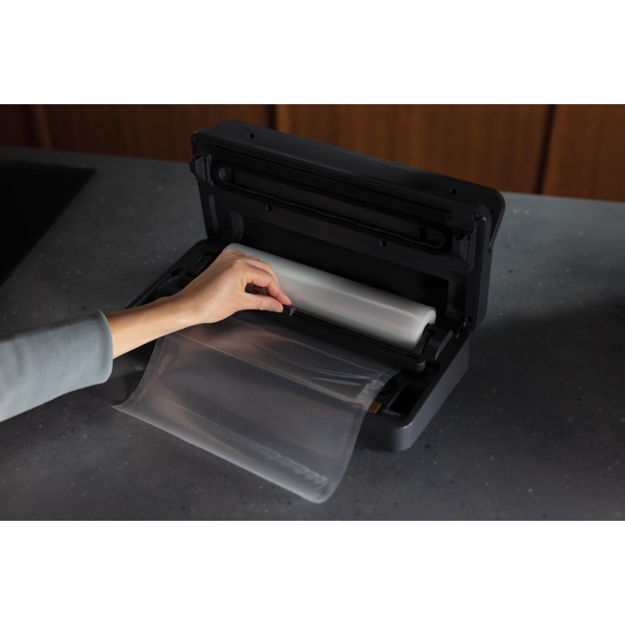 Зручна вбудована ручка для легкого доступу до пакетів. Пристрій постачається з тримачем для рулону й різаком, які допомагають швидко підготовлювати пакети й пакувати продукти.