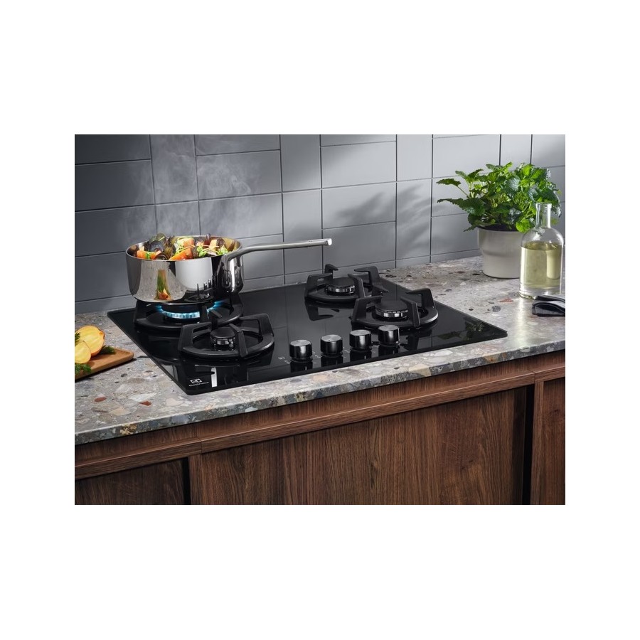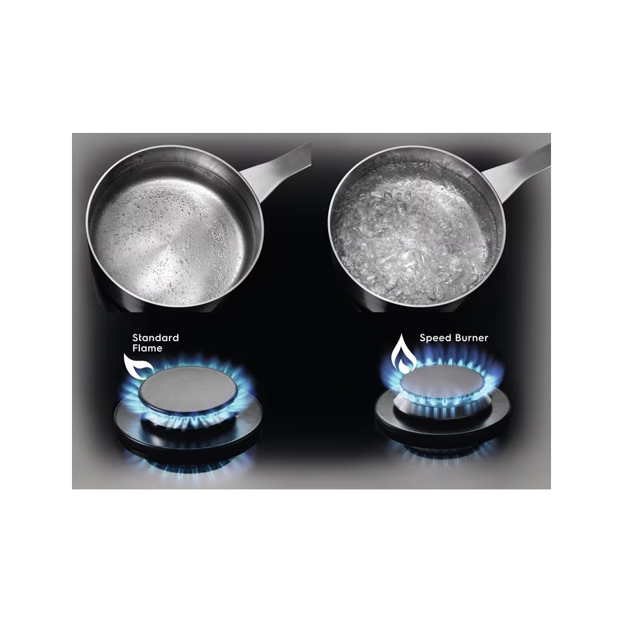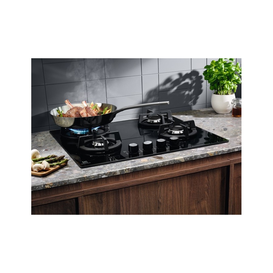 Швидкісна конфорка цієї газової варильної поверхні від Electrolux розроблена для швидкого досягнення дна каструль і сковорідок, забезпечуючи швидше та потужніше нагрівання, при цьому заощаджуючи до 20% на енергії. Потужне нагрівання для повнішого смаку. Пальник «мульти-корона» конфорки вок 4k розроблений для забезпечення більш потужного полум'я, надаючи додаткової потужності для готування справжніх страв азіатської кухні. Елегантність без зусиль. Скляну поверхню варильної панелі легко витирати, підтримуючи охайний та чистий вигляд кухні. Точне регулювання полум'я. Повністю контролюйте варильну поверхню завдяки чутливим газовим кранам. Вони допомагають легко регулювати рівень полум'я, щоб завжди готувати з потрібним рівнем нагрівання. Безпека без роздумів. Газова варильна поверхня оснащена автоматичною функцією безпеки, яка вимикає газ у випадку раптового згасання полум'я.