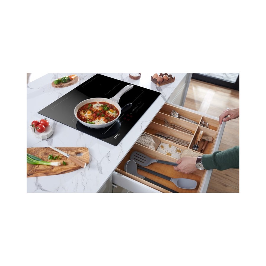 Облаштувати кухню відповідно до останніх тенденцій з тонкою стільницею? Легко, якщо ви виберете універсальну індукційну поверхню Hansa! Ви можете встановити її практично на будь-яку стільницю — навіть на ту, яка має товщину лише 12 мм над висувним ящиком, або на стільницю 28 мм над духовою шафою Hansa. Сучасний дизайн варильної панелі не вимагає використання передньої вентиляції або перегородки, тому ви можете використовувати простір під варильною поверхнею по максимуму. Гнучкість у плануванні кухні, комфорт використання та унікальний дизайн.