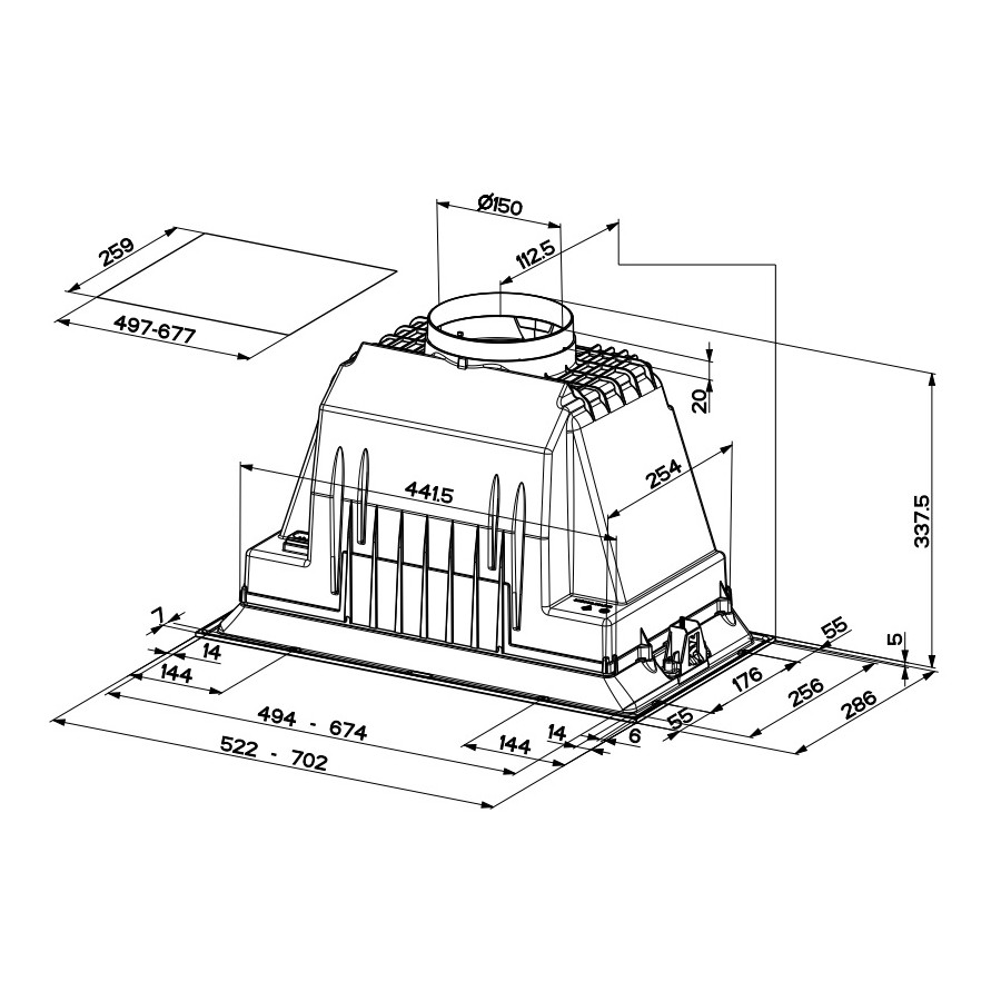 Естетично виконаний зі смаком цей вбудований блок може бути встановлений у всіх типах настінних кухонних шаф. Привабливий зовнішній вигляд поєднується з високою ефективністю витяжки та компактними розмірами, що дозволяє розмістити витяжку навіть у дуже тонких навісах.