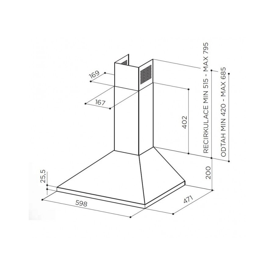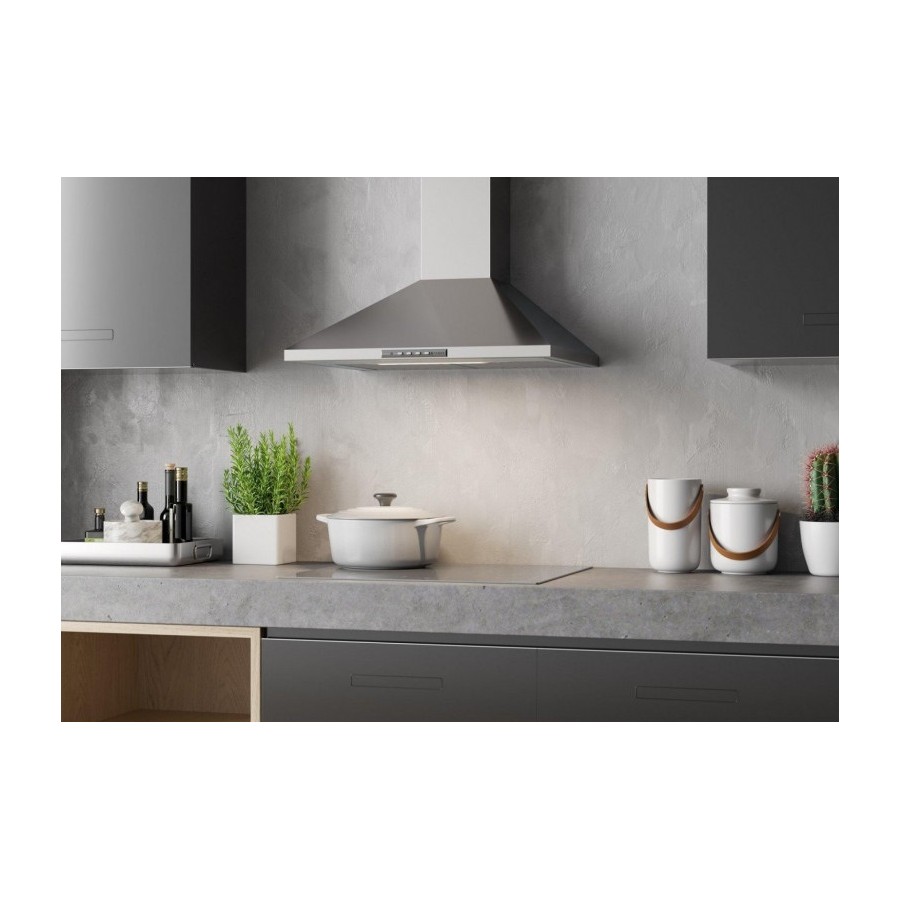 Витяжка має ширину 60 см, що робить її підходящою для стандартних кухонь. Максимальна продуктивність цієї витяжки становить 718 м3/год. Це означає, що вона здатна видаляти до 718 кубічних метрів повітря за годину, забезпечуючи ефективне видалення запахів, пару та диму під час приготування їжі. Витяжка виготовлена з нержавіючої сталі, що забезпечує їй міцність, стійкість до корозії та довговічність. Також вона оснащена вбудованими світлодіодними лампами, які забезпечують достатнє освітлення робочої поверхні під час готування.