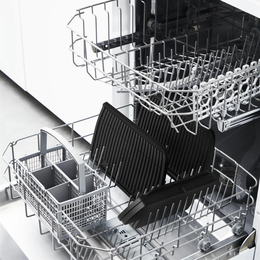 Антипригарні пластини та піддон для жиру, які можна мити в посудомийній машині, спрощують очищення.