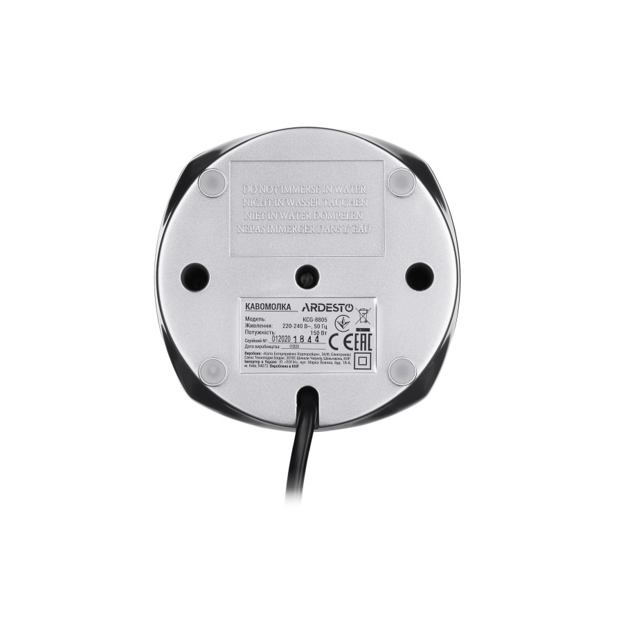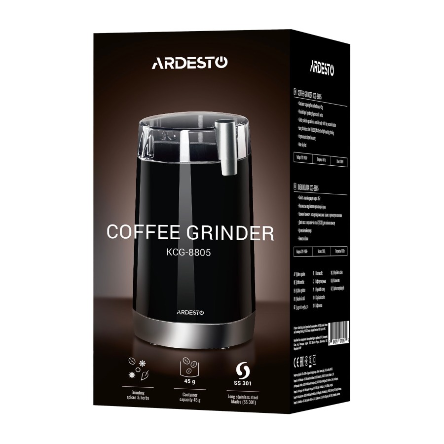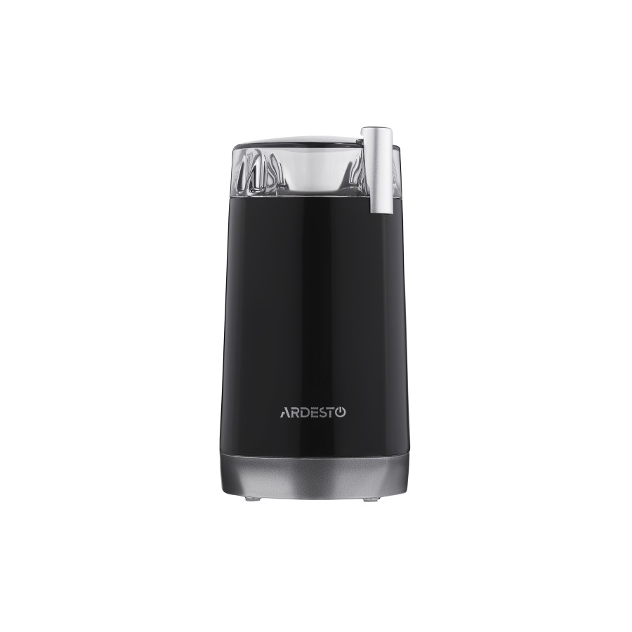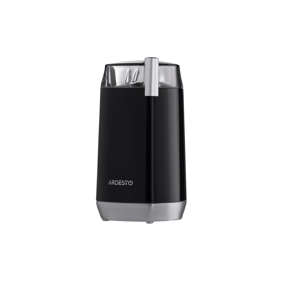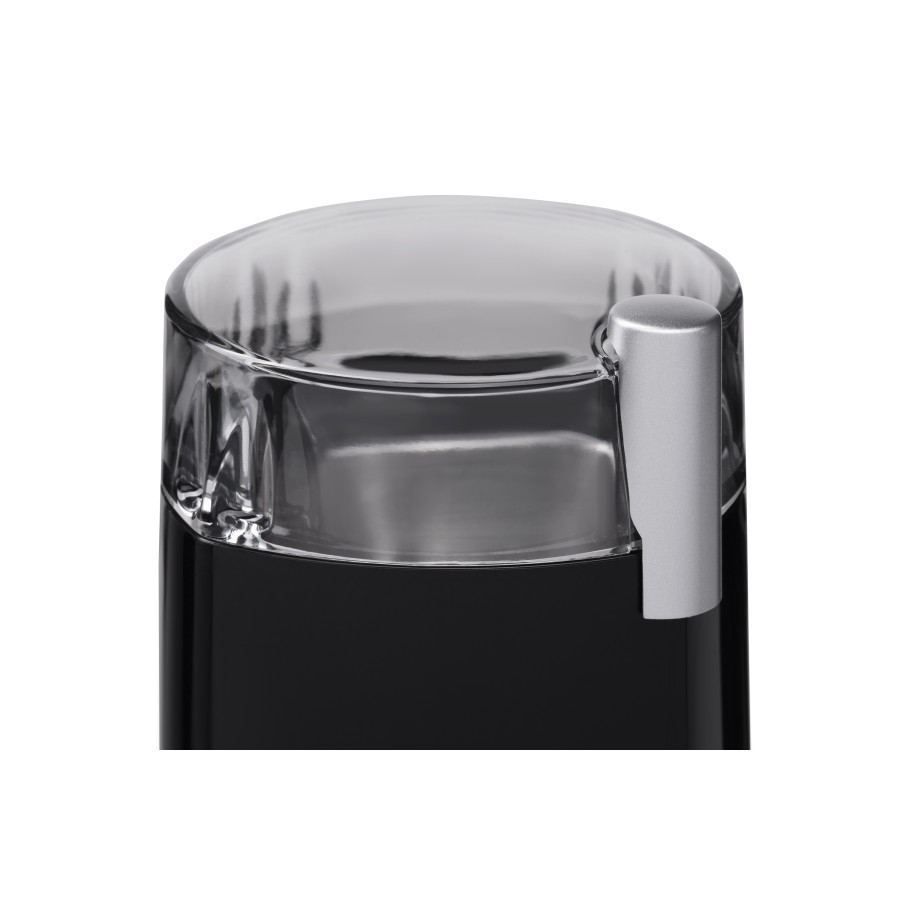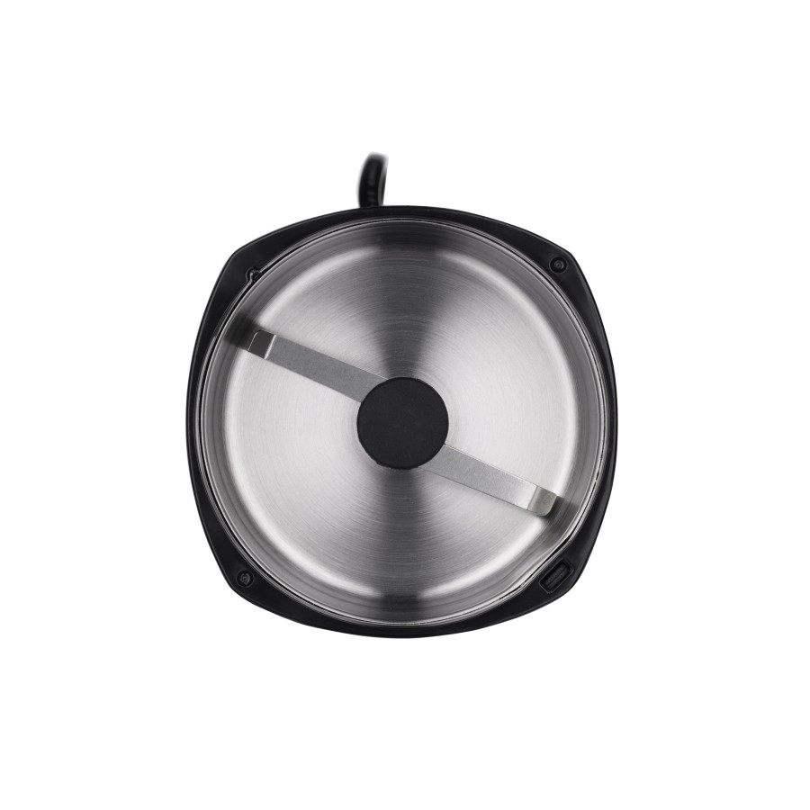 Якісний помел забезпечує гострі леза з нержавіючої сталі. Кавомолку також можна використовувати для подрібнення горіхів, спецій та інших сипучих продуктів. Безпечна робота реалізована за рахунок продуманої конструкції – запуск кавомолки відбувається тільки із закритою кришкою. Корпус кавомолки виконаний з міцного чорного глянсового пластику і вставок сріблястого кольору. Прозора кришка дозволяє контролювати процес роботи, а внутрішній сталевий контейнер на 45 г – простий доступ до подрібнених продуктів та легке очищення.