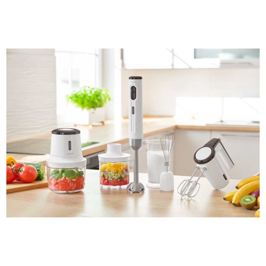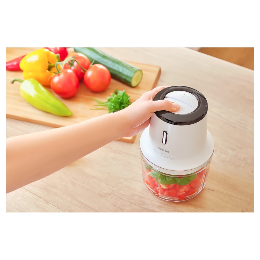 Високопродуктивний акумуляторний подрібнювач їжі Sencor SCB9001GY, що живиться від акумулятора. Простий у використанні, 2 швидкості подрібнення. Достатня потужність для подрібнення м'яса, фруктів і овочів. Титанова поверхня леза для збереження вітамінів. Чаша з міцного скла ємністю 500 мл. Світлодіодний індикатор заряду батареї. Зарядний адаптер із кабелем USB-C